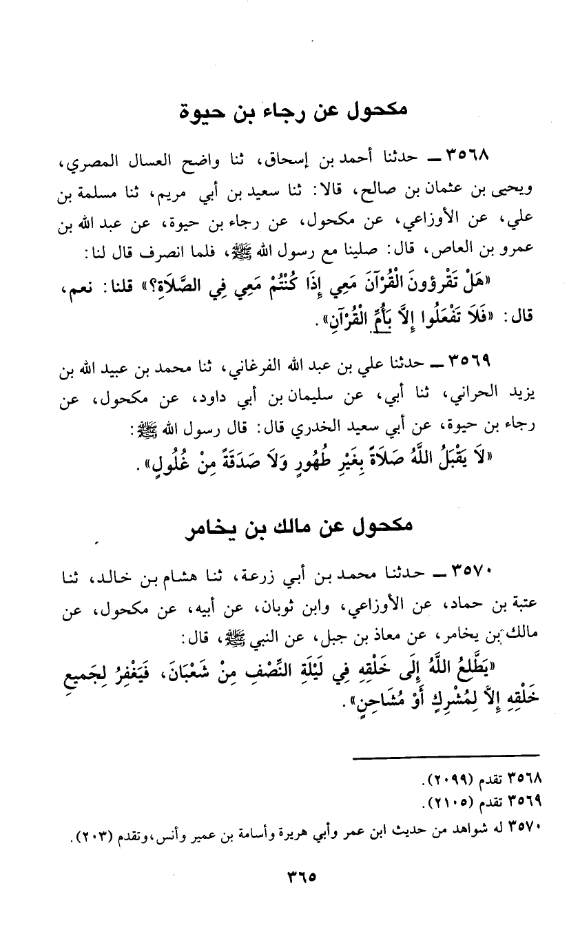 3568 - حَدَّثَنَا أَحْمَدُ بْنُ إِسْحَاقَ بْنِ وَاضِحٍ الْعَسَّالُ الْمِصْرِيُّ، وَيَحْيَى بْنُ عُثْمَانَ بْنِ صَالِحٍ، قَالَا: ثَنَا سَعِيدُ بْنُ أَبِي مَرْيَمَ، ثَنَا مَسْلَمَةُ بْنُ عُلَيٍّ، عَنِ الْأَوْزَاعِيِّ، عَنْ مَكْحُولٍ، عَنْ رَجَاءِ بْنِ حَيْوَةَ، عَنْ عَبْدِ اللَّهِ بْنِ عَمْرِو بْنِ الْعَاصِ، قَالَ: صَلَّيْنَا مَعَ رَسُولِ اللَّهِ صَلَّى اللهُ عَلَيْهِ وَسَلَّمَ، فَلَمَّا انْصَرَفَ قَالَ لَنَا: §«هَلْ تَقْرَؤُونَ الْقُرْآنَ مَعِي إِذَا كُنْتُمْ مَعِي فِي الصَّلَاةِ؟» قُلْنَا: نَعَمْ، قَالَ: «فَلَا تَفْعَلُوا إِلَّا بِأُمِّ الْقُرْآنِ»