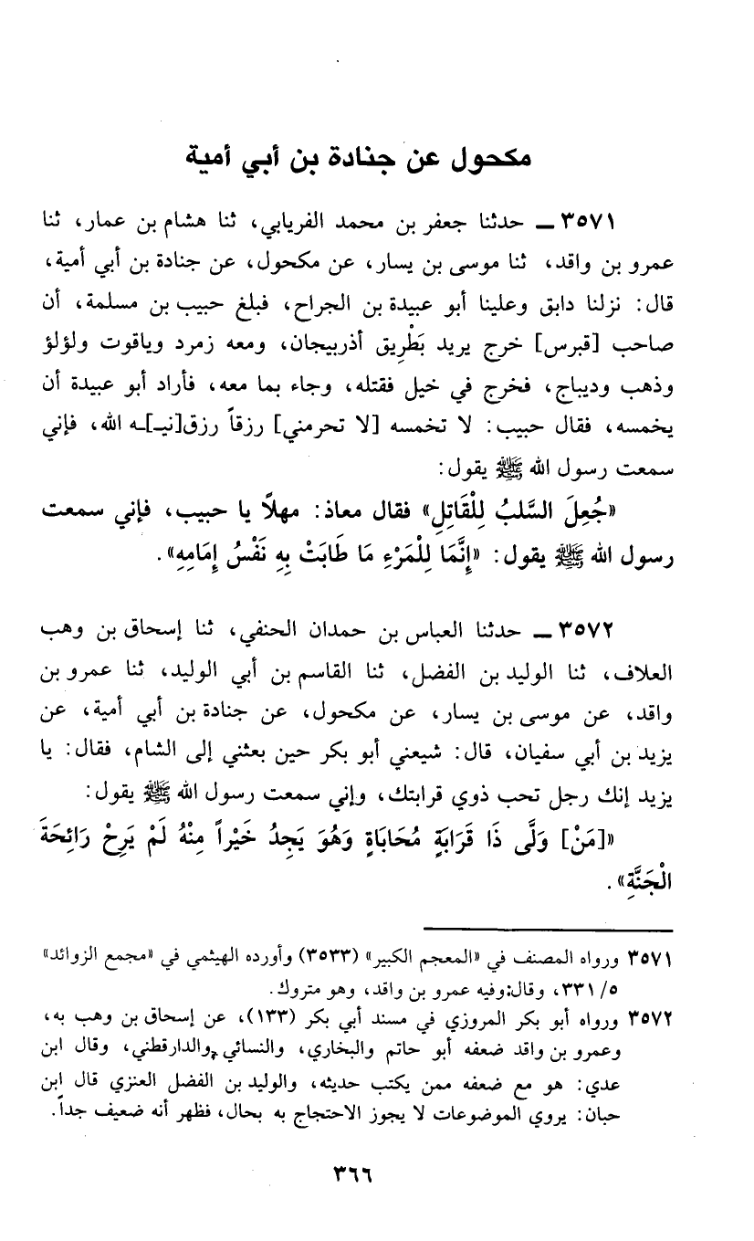 3571 - حَدَّثَنَا جَعْفَرُ بْنُ مُحَمَّدٍ الْفِرْيَابِيُّ، ثَنَا هِشَامُ بْنُ عَمَّارٍ، ثَنَا عَمْرُو بْنُ وَاقِدٍ، ثَنَا مُوسَى بْنُ يَسَارٍ، عَنْ مَكْحُولٍ، عَنْ جُنَادَةَ بْنِ أَبِي أُمَيَّةَ، قَالَ: نَزَلْنَا دَابِقَ وَعَلَيْنَا أَبُو عُبَيْدَةَ بْنُ الْجَرَّاحِ، فَبَلَّغَ حَبِيبُ بْنُ مَسْلَمَةَ، أَنَّ صَاحِبَ [قُبْرُسَ] خَرَجَ يُرِيدُ بِطَرِيقِ أَذْرَبِيجَانَ، وَمَعَهُ زُمُرُّدٌ وَيَاقُوتٌ وَلُؤْلُؤٌ وَذَهَبٌ وَدِيبَاجٌ، فَخَرَجَ فِي خَيْلٍ فَقَتَلَهُ، وَجَاءَ بِمَا مَعَهُ، فَأَرَادَ أَبُو عُبَيْدَةَ أَنْ يُخَمِّسُهُ، فَقَالَ حَبِيبٌ: لَا تُخَمِّسْهُ [لَا تَحْرِمْنِي] رِزْقًا رَزَقَنِيهُ اللَّهُ، فَإِنِّي سَمِعْتُ رَسُولَ اللَّهِ صَلَّى اللهُ عَلَيْهِ وَسَلَّمَ يَقُولُ: «§جُعِلَ السَّلَبُ لِلْقَاتِلِ» فَقَالَ مُعَاذٌ: مَهْلَا يَا حَبِيبُ، فَإِنِّي سَمِعْتُ رَسُولَ اللَّهِ صَلَّى اللهُ عَلَيْهِ وَسَلَّمَ يَقُولُ «إِنَّمَا لِلْمَرْءِ مَا طَابَتْ بِهِ نَفْسُ إِمَامِهِ»