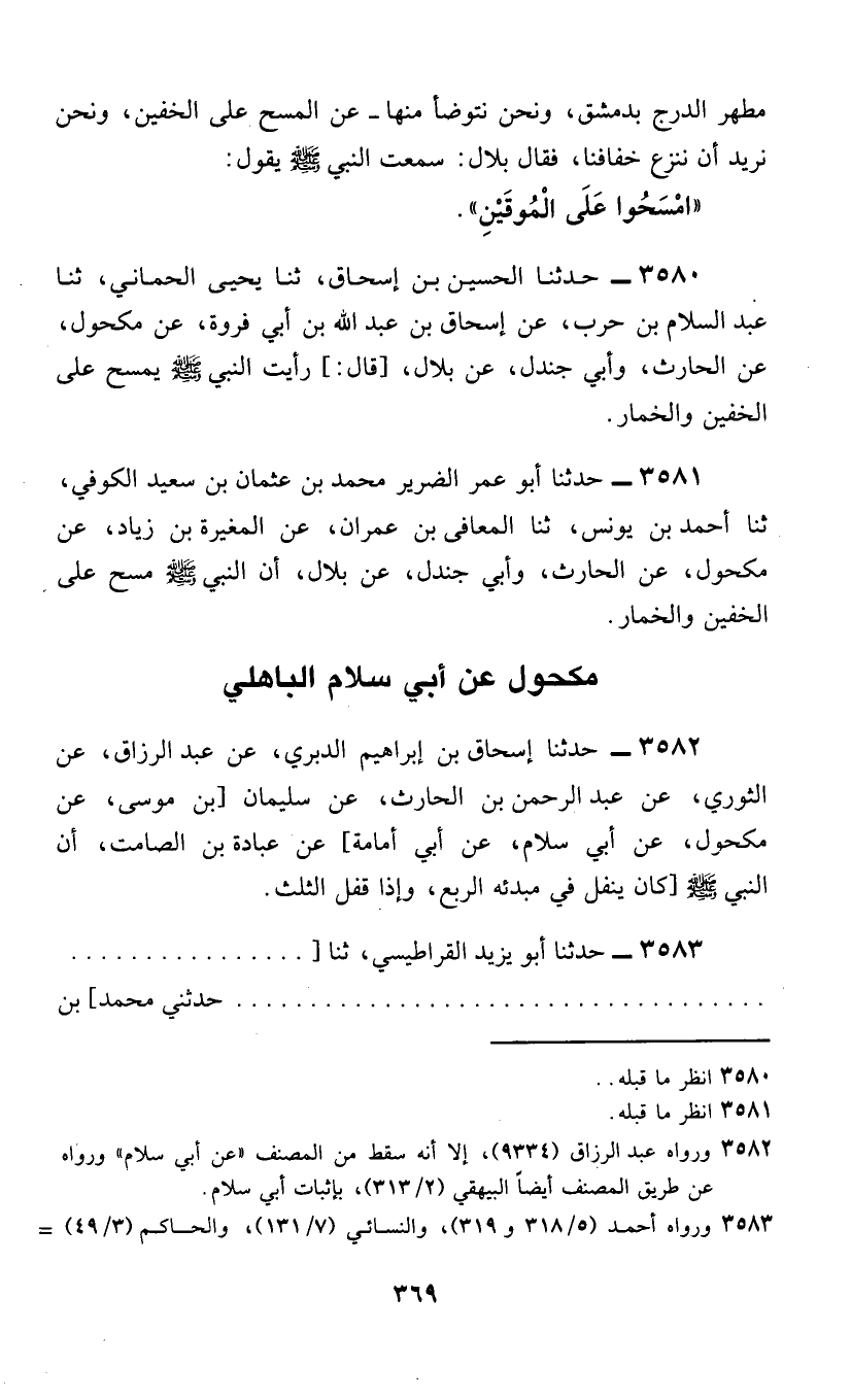 3580 - حَدَّثَنَا الْحُسَيْنُ بْنُ إِسْحَاقَ، ثَنَا يَحْيَى الْحِمَّانِيُّ، ثَنَا عَبْدُ السَّلَامِ بْنُ حَرْبٍ، عَنْ إِسْحَاقَ بْنِ عَبْدِ اللَّهِ بْنِ أَبِي فَرْوَةَ، عَنْ مَكْحُولٍ، عَنِ الْحَارِثِ، وَأَبِي جَنْدَلٍ، عَنْ بِلَالٍ، قَالَ: رَأَيْتُ النَّبِيَّ صَلَّى اللهُ عَلَيْهِ وَسَلَّمَ §«يَمْسَحُ عَلَى الْخُفَّيْنِ وَالْخِمَارِ»