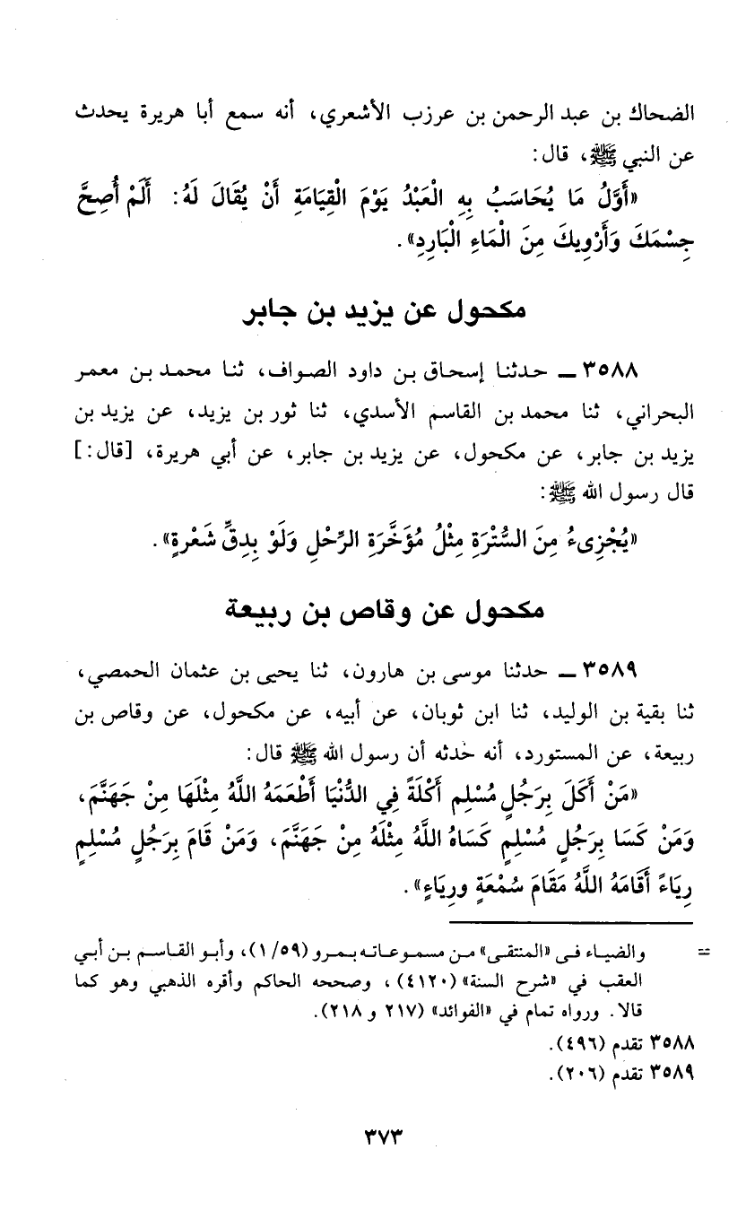 3589 - حَدَّثَنَا مُوسَى بْنُ هَارُونَ، ثَنَا يَحْيَى بْنُ عُثْمَانَ الْحِمْصِيُّ، ثَنَا بَقِيَّةُ بْنُ الْوَلِيدِ، ثَنَا ابْنُ ثَوْبَانَ، عَنْ أَبِيهِ، عَنْ مَكْحُولٍ، عَنْ وَقَّاصِ بْنِ رَبِيعَةَ، عَنِ الْمُسْتَورِدِ، أَنَّهُ حَدَّثَهُ أَنَّ رَسُولَ اللَّهِ صَلَّى اللهُ عَلَيْهِ وَسَلَّمَ قَالَ: §«مَنْ أَكَلَ بِرَجُلٍ مُسْلِمٍ أَكْلَةً فِي الدُّنْيَا أَطْعَمَهُ اللَّهُ مِثْلَهَا مِنْ جَهَنَّمَ، وَمَنْ كَسَا بِرَجُلٍ مُسْلِمٍ كَسَاهُ اللَّهُ مِثْلَهُ مِنْ جَهَنَّمَ، وَمَنْ قَامَ بِرَجُلٍ مُسْلِمٍ رِيَاءً أَقَامَهُ اللَّهُ مَقَامَ سُمْعَةٍ وَرِيَاءٍ»