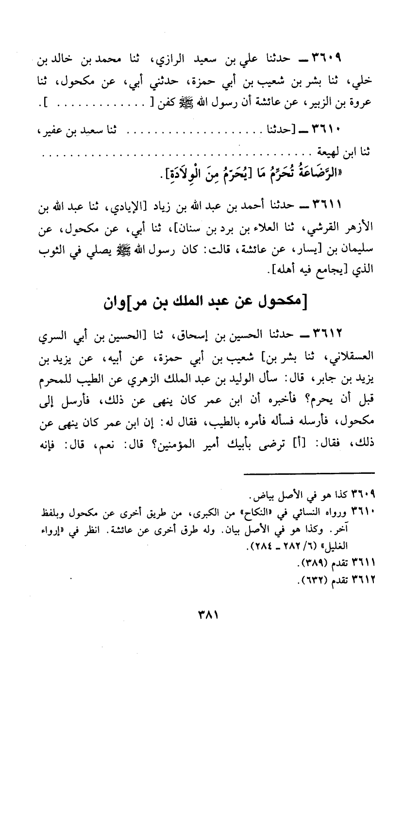 3612 - حَدَّثَنَا الْحُسَيْنُ بْنُ إِسْحَاقَ، ثَنَا [الْحُسَيْنُ بْنُ أَبِي السُّرِّي الْعَسْقَلَانِيُّ، ثَنَا بِشْرُ بْنُ] شُعَيْبِ بْنِ أَبِي حَمْزَةَ، عَنْ أَبِيهِ، عَنْ يَزِيدَ بْنِ يَزِيدَ بْنِ جَابِرٍ، قَالَ: سَأَلَ الْوَلِيدُ بْنُ عَبْدِ الْمَلِكِ الزُّهْرِيَّ عَنِ الطِّيبِ، لِلْمُحْرِمِ قَبْلَ أَنْ يُحْرِمَ؟ فَأَخْبَرَهُ أَنَّ ابْنَ عُمَرَ كَانَ يَنْهَى عَنْ ذَلِكَ، فَأَرْسَلَ إِلَى مَكْحُولٍ، فَأَرْسَلَهُ، فَسَأَلَهُ فَأَمَرَهُ بِالطِّيبِ، فَقَالَ لَهُ: إِنَّ ابْنَ عُمَرَ كَانَ يَنْهَى عَنْ ذَلِكَ، فَقَالَ [أَ] تَرْضَى بِأَبِيكَ أَمِيرِ الْمُؤْمِنِينَ؟ قَالَ: نَعَمْ، قَالَ: فَإِنَّهُ -[382]- أَخْبَرَنِي عَنُ عَائِشَةَ أَنَّهَا قَالَتْ: §«طَيَّبْتُ رَسُولَ اللَّهِ صَلَّى اللهُ عَلَيْهِ وَسَلَّمَ لِإِحْرَامِهِ حِينَ أَحْرَمَ، وَلِحِلِّهِ حِينَ أَحَلَّ» ، فَأَخَذَ بِهِ الْوَلِيدُ
