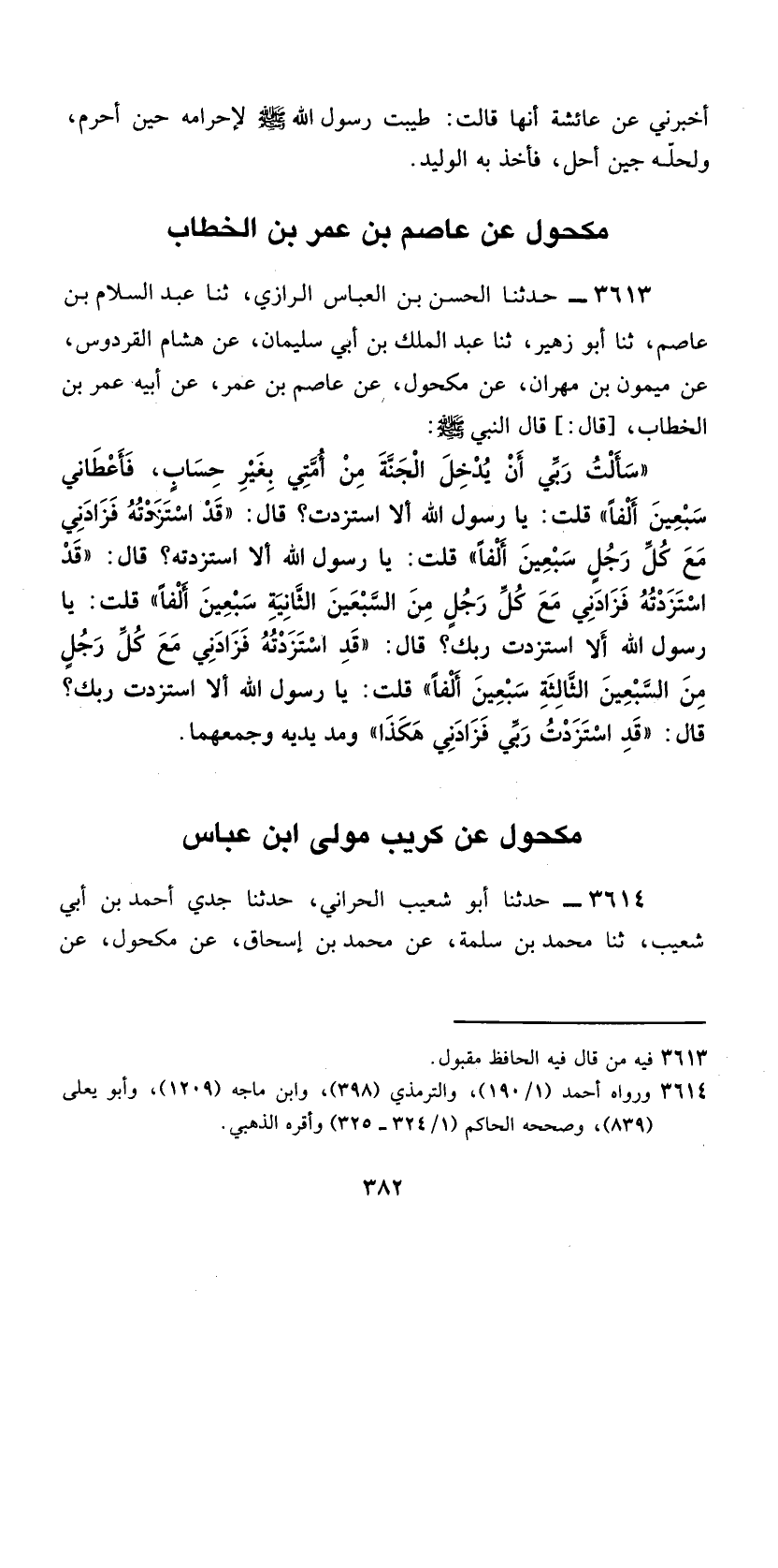 3613 - حَدَّثَنَا الْحَسَنُ بْنُ الْعَبَّاسِ الرَّازِيُّ، ثَنَا عَبْدُ السَّلَامِ بْنُ عَاصِمٍ، ثَنَا أَبُو زُهَيْرٍ، ثَنَا عَبْدُ الْمَلِكِ بْنُ أَبِي سُلَيْمَانَ، عَنْ هِشَامٍ الْقَرْدُوسِ، عَنْ مَيْمُونِ بْنِ مِهْرَانَ، عَنْ مَكْحُولٍ، عَنْ عَاصِمِ بْنِ عُمَرَ، عَنْ أَبِيهِ، عُمَرِ بْنِ الْخَطَّابِ، قَالَ: قَالَ النَّبِيُّ صَلَّى اللهُ عَلَيْهِ وَسَلَّمَ: «§سَأَلْتُ رَبِّي أَنْ يُدْخِلَ الْجَنَّةَ مِنْ أُمَّتِي بِغَيْرِ حِسَابٍ، فَأَعْطَانِي سَبْعِينَ أَلْفًا» قُلْتُ: يَا رَسُولَ اللَّهِ أَلَا اسْتَزَدْتَ؟ قَالَ: «قَدِ اسْتَزَدْتُهُ فَزَادَنِي مَعَ كُلِّ رَجُلٍ سَبْعِينَ أَلْفًا» قُلْتُ: يَا رَسُولَ اللَّهِ، أَلَا اسْتَزَدْتُهُ؟ قَالَ: «قَدِ اسْتَزَدْتُهُ فَزَادَنِي مَعَ كُلِّ رَجُلٍ مِنَ السَّبْعِينَ الثَّانِيَةِ سَبْعِينَ أَلْفًا» قُلْتُ: يَا رَسُولَ اللَّهِ، أَلَا اسْتَزَدْتَ رَبِّكَ؟ قَالَ: «قَدِ اسْتَزَدْتُهُ فَزَادَنِي مَعَ كُلِّ رَجُلٍ مِنَ السَّبْعِينَ الثَّالِثَةِ سَبْعِينَ أَلْفًا» قُلْتُ: يَا رَسُولَ اللَّهِ أَلَا اسْتَزَدْتَ رَبَّكَ؟ قَالَ: «قَدِ اسْتَزَدْتُ رَبِّي فَزَادَنِي هَكَذَا» وَمَدَّ يَدَيْهِ وَجَمَعَهَمَا