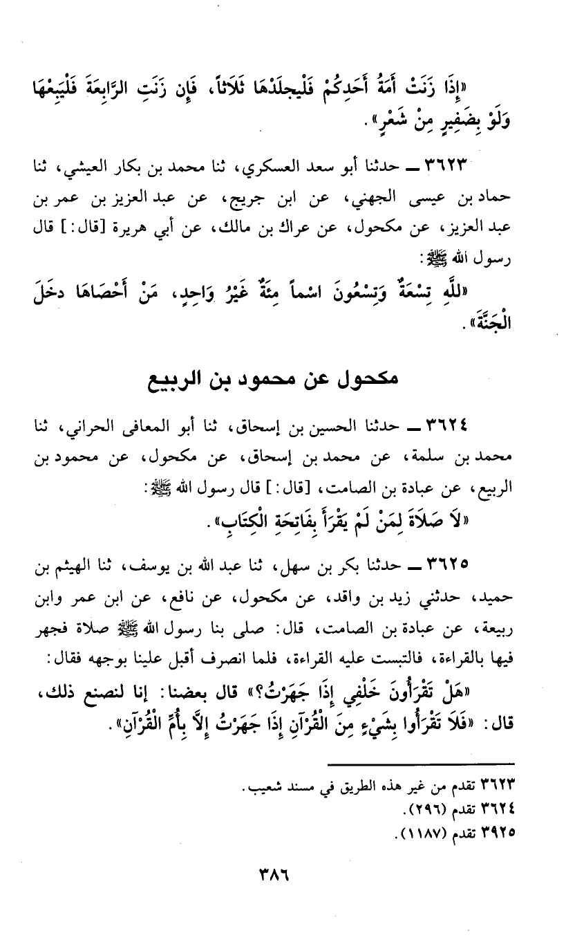 3625 - حَدَّثَنَا بَكْرُ بْنُ سَهْلٍ، ثَنَا عَبْدُ اللَّهِ بْنُ يُوسُفَ، ثَنَا الْهَيْثَمُ بْنُ حُمَيْدٍ، حَدَّثَنِي زَيْدُ بْنُ وَاقِدٍ، عَنْ مَكْحُولٍ، عَنْ نَافِعٍ، عَنِ ابْنِ عُمَرَ، وَابْنِ رَبِيعَةَ، عَنْ عُبَادَةَ بْنِ الصَّامِتِ، قَالَ: صَلَّى بِنَا رَسُولُ اللَّهِ صَلَّى اللهُ عَلَيْهِ وَسَلَّمَ صَلَاةً فَجَهَرَ فِيهَا بِالْقِرَاءَةِ، فَالْتَبَسَتْ عَلَيْهِ الْقِرَاءَةُ، فَلَمَّا انْصَرَفَ أَقْبَلَ عَلَيْنَا بِوَجْهِهِ فَقَالَ: «هَلْ تَقْرَأُونَ خَلْفِي إِذَا جَهَرْتُ؟» قَالَ بَعْضُنَا: إِنَّا لَنَصْنَعُ ذَلِكَ، قَالَ: §«فَلَا تَقْرَأُوا بِشَيْءٍ مِنَ الْقُرْآنِ إِذَا جَهَرْتُ إِلَّا بِأُمِّ الْقُرْآنِ»