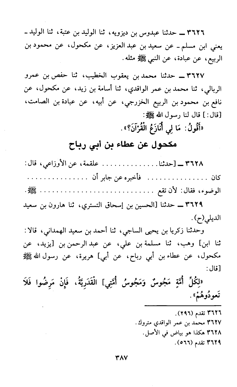 3629 - حَدَّثَنَا الْحُسَيْنُ بْنُ إِسْحَاقَ التُّسْتَرِيُّ، ثَنَا هَارُونُ بْنُ سَعِيدٍ الدَّيْلِيُّ، ح وَحَدَّثَنَا زَكَرِيَا بْنُ يَحْيَى السَّاجِيُّ، ثَنَا أَحْمَدُ بْنُ سَعِيدٍ الْهَمْدَانِيُّ، قَالَا: ثَنَا ابْنُ [وَهْبٍ، ثَنَا مَسْلَمَةُ بْنُ عُلَيٍّ، عَنْ عَبْدِ الرَّحْمَنِ بْنِ] يَزِيدَ، عَنْ مَكْحُولٍ، عَنْ عَطَاءِ بْنِ أَبِي رَبَاحٍ، عَنْ أَبِي [هُرَيْرَةَ، عَنْ رَسُولِ اللَّهِ صَلَّى اللهُ عَلَيْهِ وَسَلَّمَ] قَالَ: «§لِكُلِّ أُمَّةٍ مَجُوسٌ، وَمَجُوسُ أُمَّتِي [الْقَدْرِيَّةُ، فَإِنْ مَرِضُوا فَلَا تَعُودُوهُمْ»