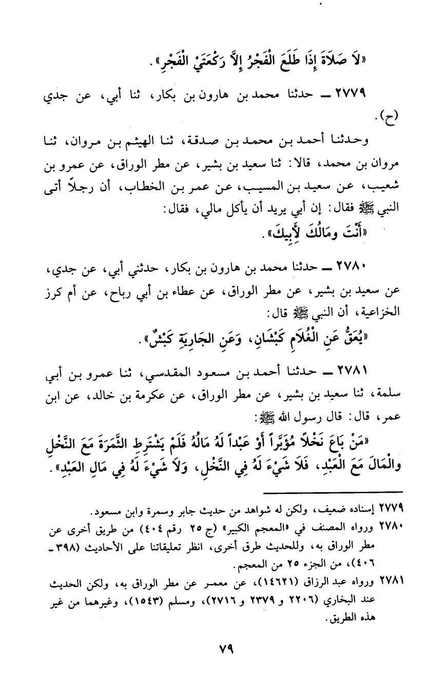 2779 - حَدَّثَنَا مُحَمَّدُ بْنُ هَارُونَ بْنِ بَكَّارٍ، ثَنَا أَبِي، عَنْ جَدِّي، ح وحَدَّثَنَا أَحْمَدُ بْنُ مُحَمَّدِ بْنِ صَدَقَةَ، ثَنَا الْهَيْثَمُ بْنُ مَرْوَانَ، ثَنَا مَرْوَانُ بْنُ مُحَمَّدٍ، قَالَا: ثَنَا سَعِيدُ بْنُ بَشِيرٍ، عَنْ مَطَرٍ الْوَرَّاقِ، عَنْ عَمْرِو بْنِ شُعَيْبٍ، عَنْ سَعِيدِ بْنِ الْمُسَيِّبِ، عَنْ عُمَرَ بْنِ الْخَطَّابِ، أَنَّ رَجُلًا، أَتَى النَّبِيَّ صَلَّى اللهُ عَلَيْهِ وَسَلَّمَ فَقَالَ: إِنَّ أَبِي يُرِيدُ أَنْ يَأْكُلَ مَالِي، فَقَالَ: §«أَنْتَ وَمَالُكَ لِأَبِيكَ»