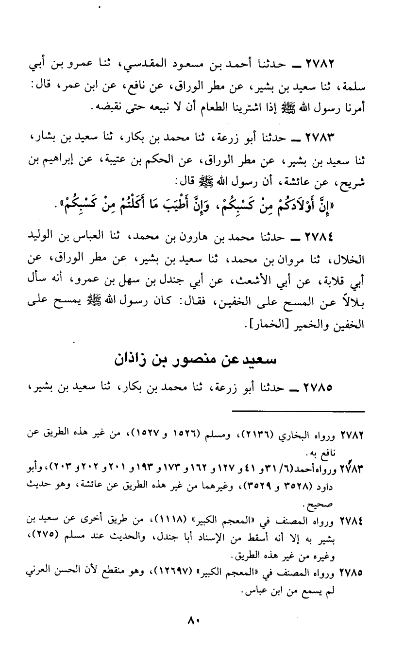 2783 - حَدَّثَنَا أَبُو زُرْعَةَ، ثَنَا مُحَمَّدُ بْنُ بَكَّارٍ، ثَنَا، ثَنَا سَعِيدُ بْنُ بَشِيرٍ، عَنْ مَطَرٍ الْوَرَّاقِ، عَنِ الْحَكَمِ بْنِ عُتَيْبَةَ، عَنْ إِبْرَاهِيمَ، عَنْ شُرَيْحٍ، عَنْ عَائِشَةَ، أَنَّ رَسُولَ اللَّهِ صَلَّى اللهُ عَلَيْهِ وَسَلَّمَ قَالَ: «إِنَّ §أَوْلَادَكُمْ مِنْ كَسْبِكُمْ، وَإِنَّ أَطْيَبَ مَا أَكَلْتُمْ مِنْ كَسْبِكُمْ»