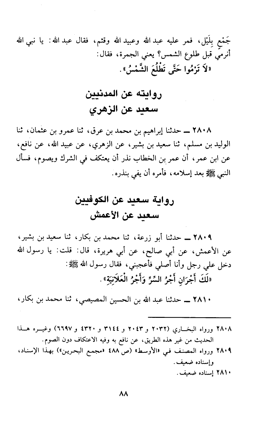 2808 - حَدَّثَنَا إِبْرَاهِيمُ بْنُ مُحَمَّدِ بْنِ عِرْقٍ، ثَنَا عَمْرُو بْنُ عُثْمَانَ، ثَنَا الْوَلِيدُ بْنُ مُسْلِمٍ، ثَنَا سَعِيدُ بْنُ بَشِيرٍ، عَنِ الزُّهْرِيِّ، عَنْ عُبَيْدِ اللَّهِ، عَنْ نَافِعٍ، عَنِ ابْنِ عُمَرَ، أَنَّ عُمَرَ بْنَ الْخَطَّابِ، نَذَرَ أَنْ يَعْتَكِفَ، فِي الشِّرْكِ وَيَصُومُ، فَسَأَلَ النَّبِيَّ صَلَّى اللهُ عَلَيْهِ وَسَلَّمَ بَعْدَ إِسْلَامِهِ، §فَأَمَرَهُ أَنْ يَفِيَ بِنَذْرِهِ