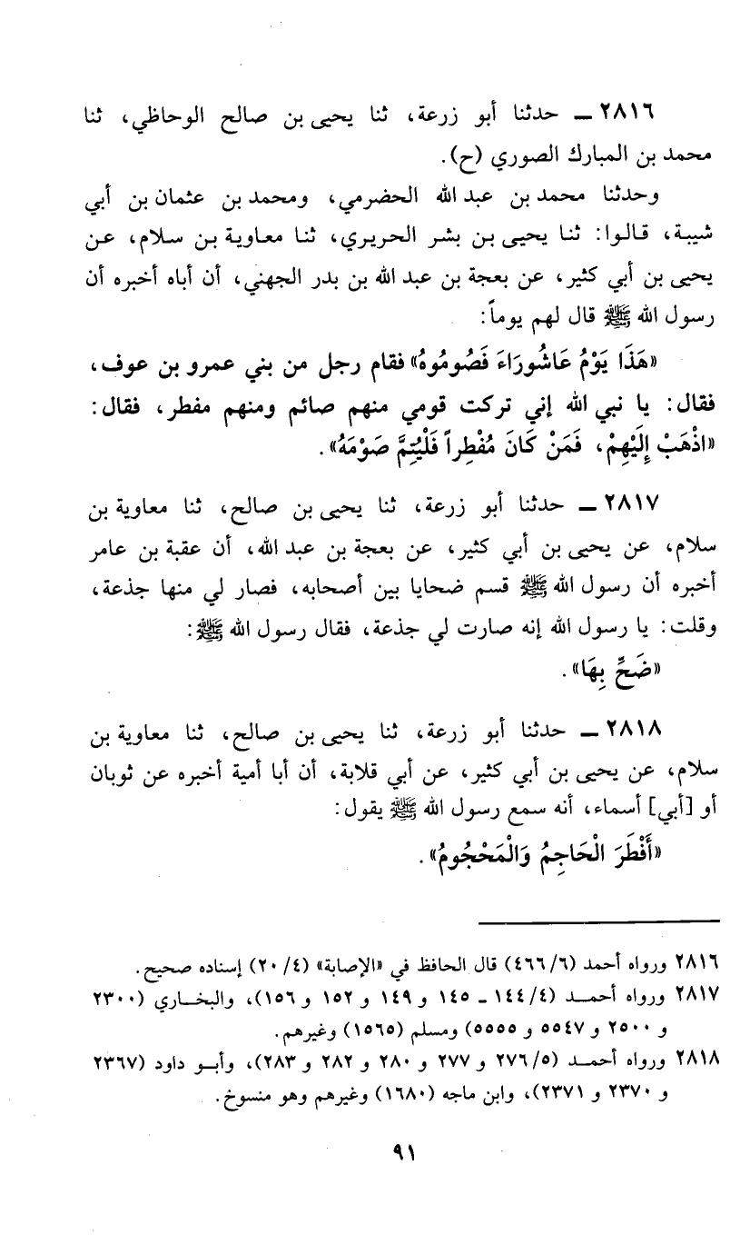 2816 - حَدَّثَنَا أَبُو زُرْعَةَ، ثَنَا يَحْيَى بْنُ صَالِحٍ الْوُحَاظِيُّ، ثَنَا مُحَمَّدُ بْنُ الْمُبَارَكِ الصُّورِيُّ، ح وحَدَّثَنَا مُحَمَّدُ بْنُ عَبْدِ اللَّهِ الْحَضْرَمِيُّ، وَمُحَمَّدُ بْنُ عُثْمَانَ بْنُ أَبِي شَيْبَةَ، قَالُوا: ثَنَا يَحْيَى بْنُ بِشْرٍ الْحَرِيرِيُّ، ثَنَا مُعَاوِيَةُ بْنُ سَلَّامٍ، عَنْ يَحْيَى بْنِ أَبِي كَثِيرٍ، عَنْ بَعْجَةَ بْنِ عَبْدِ اللَّهِ بْنِ بَدْرِ الْجُهَنِيُّ، أَنَّ أَبَاهُ، أَخْبَرَهُ أَنَّ رَسُولَ اللَّهِ صَلَّى اللهُ عَلَيْهِ وَسَلَّمَ قَالَ لَهُمْ يَوْمًا: «هَذَا يَوْمُ عَاشُورَاءَ فَصُومُوهُ» فَقَامَ رَجُلٌ مِنْ بَنِي عَمْرِو بْنِ عَوْفٍ، فَقَالَ: يَا نَبِيَّ اللَّهِ، إِنِّي تَرَكْتُ قَوْمِي مِنْهُمْ صَائِمٌ وَمِنْهُمْ مُفْطِرٌ، فَقَالَ: «§اذْهَبْ إِلَيْهِمْ، فَمَنْ كَانَ مُفْطِرًا فَلْيُتِمَّ صَوْمَهُ»