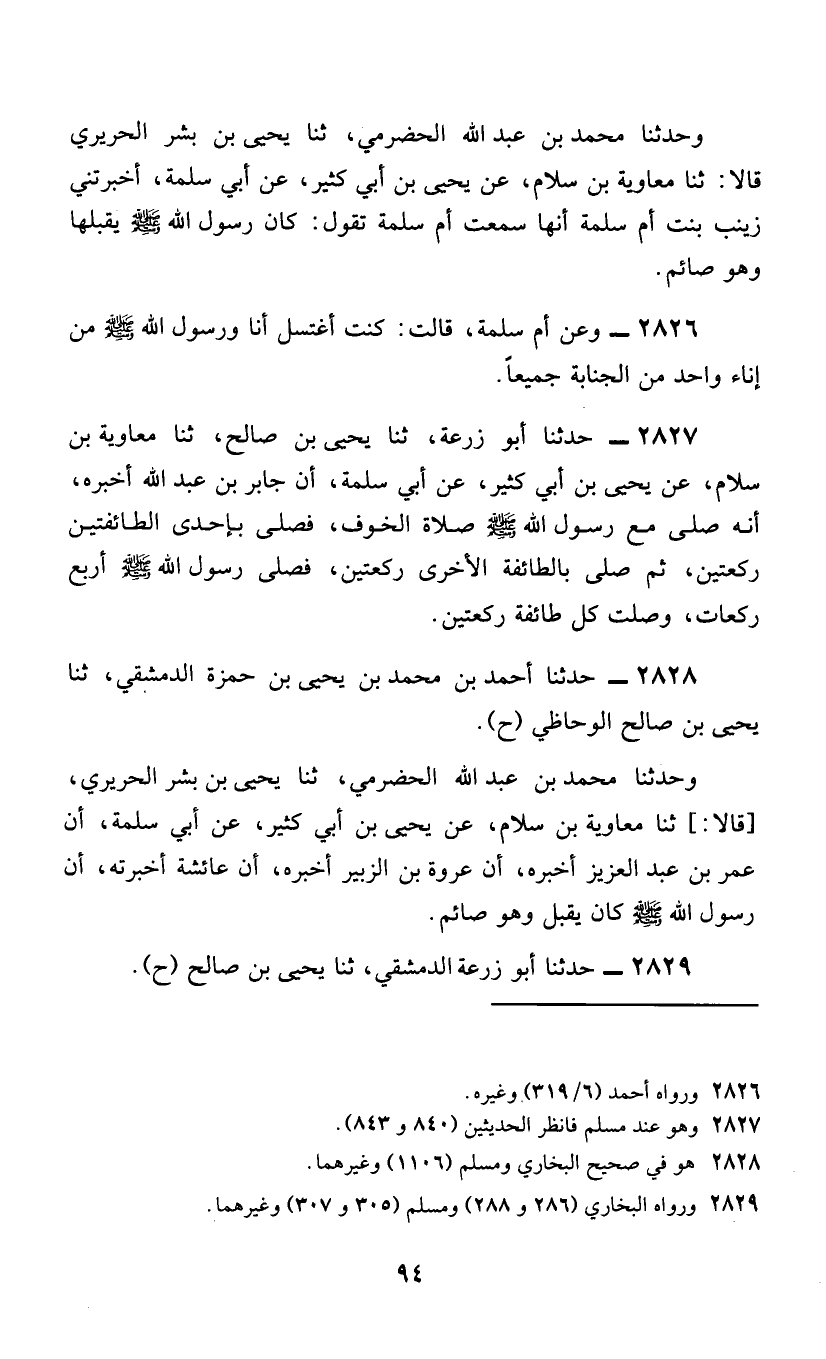 2828 - حَدَّثَنَا أَحْمَدُ بْنُ مُحَمَّدِ بْنِ يَحْيَى بْنِ حَمْزَةَ الدِّمَشْقِيُّ، ثَنَا يَحْيَى بْنُ صَالِحٍ الْوُحَاظِيُّ، ح وحَدَّثَنَا مُحَمَّدُ بْنُ عَبْدِ اللَّهِ الْحَضْرَمِيُّ، ثَنَا يَحْيَى بْنُ بِشْرٍ الْحَرِيرِيُّ، قَالَا: ثَنَا مُعَاوِيَةُ بْنُ سَلَّامٍ، عَنْ يَحْيَى بْنِ أَبِي كَثِيرٍ، عَنْ أَبِي سَلَمَةَ، أَنَّ عُمَرَ بْنَ عَبْدِ الْعَزِيزِ، أَخْبَرَهُ، أَنَّ عُرْوَةَ بْنَ الزُّبَيْرِ أَخْبَرَهُ، أَنَّ عَائِشَةَ أَخْبَرَتْهُ، أَنَّ رَسُولَ اللَّهِ صَلَّى اللهُ عَلَيْهِ وَسَلَّمَ «كَانَ §يُقَبِّلُ وَهُوَ صَائِمٌ»