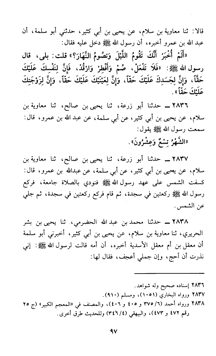 2836 - حَدَّثَنَا أَبُو زُرْعَةَ، ثَنَا يَحْيَى بْنُ صَالِحٍ، ثَنَا مُعَاوِيَةُ بْنُ سَلَّامٍ، عَنْ يَحْيَى بْنِ أَبِي كَثِيرٍ، عَنْ أَبِي سَلَمَةَ، عَنْ عَبْدِ اللَّهِ بْنِ عَمْرٍو، قَالَ: سَمِعْتُ رَسُولَ اللَّهِ صَلَّى اللهُ عَلَيْهِ وَسَلَّمَ يَقُولُ: §«الشَّهْرُ تِسْعٌ وَعِشْرُونَ»