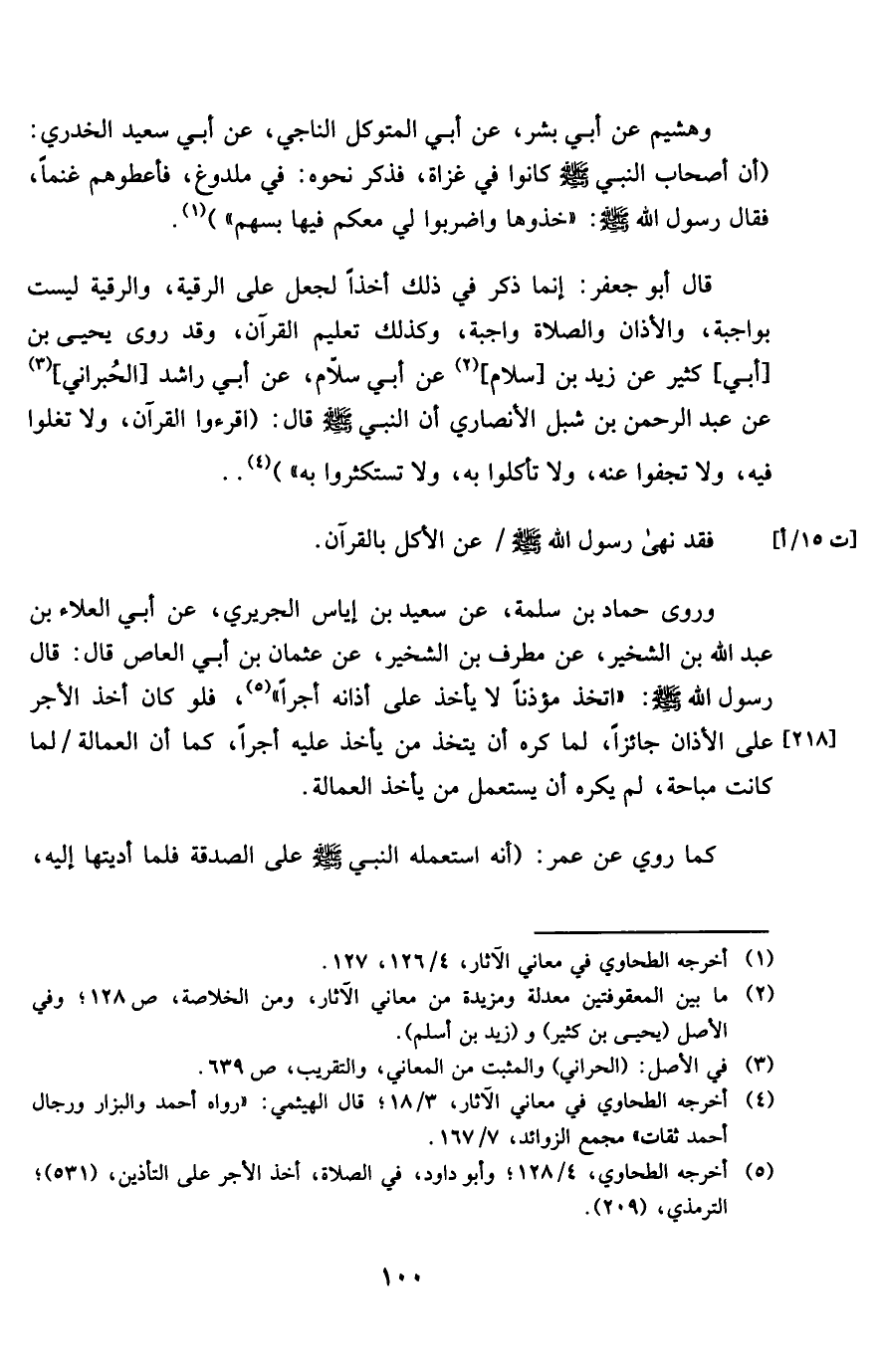 قَالَ أَبُو جَعْفَر إِنَّمَا ذكر فِي ذَلِك أخذا لجعل على الرّقية والرقية لَيست بواجبة وَالْأَذَان وَالصَّلَاة وَاجِبَة وَكَذَلِكَ تَعْلِيم الْقُرْآن وَقد روى يحيى بن أبي كثير عَن زيد بن سَلام عَن أبي سَلام عَن أبي رَاشد الحبراني عَن عبد الرَّحْمَن بن شبْل الْأنْصَارِيّ أَن النَّبِي صلى الله عَلَيْهِ وَسلم قَالَ اقْرَءُوا الْقُرْآن وَلَا تغلوا فِيهِ وَلَا تجفوا عَنهُ وَلَا تَأْكُلُوا بِهِ وَلَا تَسْتَكْثِرُوا بِهِ