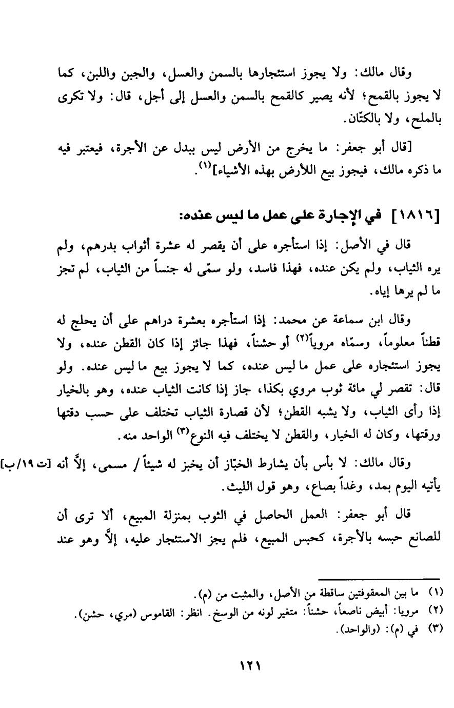 وَقَالَ ابْن سَمَّاعَة عَن مُحَمَّد إِذا اسْتَأْجرهُ بِعشْرَة دَرَاهِم على أَن يحلج لَهُ قطنا مَعْلُوما وَسَماهُ مرويا أَو حشنا فَهَذَا جَائِز إِذا كَانَ الْقطن عِنْده وَلَا يجوز استئجاره على عمل مَا لَيْسَ عِنْده كَمَا لَا يجوز بيع مَا لَيْسَ عِنْده وَلَو قَالَ تقصر لي مائَة ثوب مَرْوِيّ بِكَذَا جَازَ إِذا كَانَت الثِّيَاب عِنْده وَهُوَ بِالْخِيَارِ إِذا رأى الثِّيَاب وَلَا يشبه الْقطن لِأَن قصارة الثِّيَاب تخْتَلف على حسب دقتها ورقتها وَكَانَ لَهُ الْخِيَار والقطن لَا يخْتَلف فِيهِ النَّوْع الْوَاحِد مِنْهُ