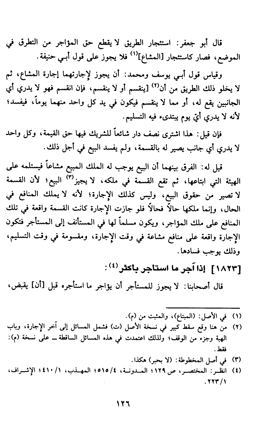 قَالَ أَبُو جَعْفَر اسْتِئْجَار الطَّرِيق لَا يقطع حق المؤاجر من التطرق فِي الْموضع فَصَارَ كاستئجار الْمشَاع فَلَا يجوز على قَول أبي حنيفَة