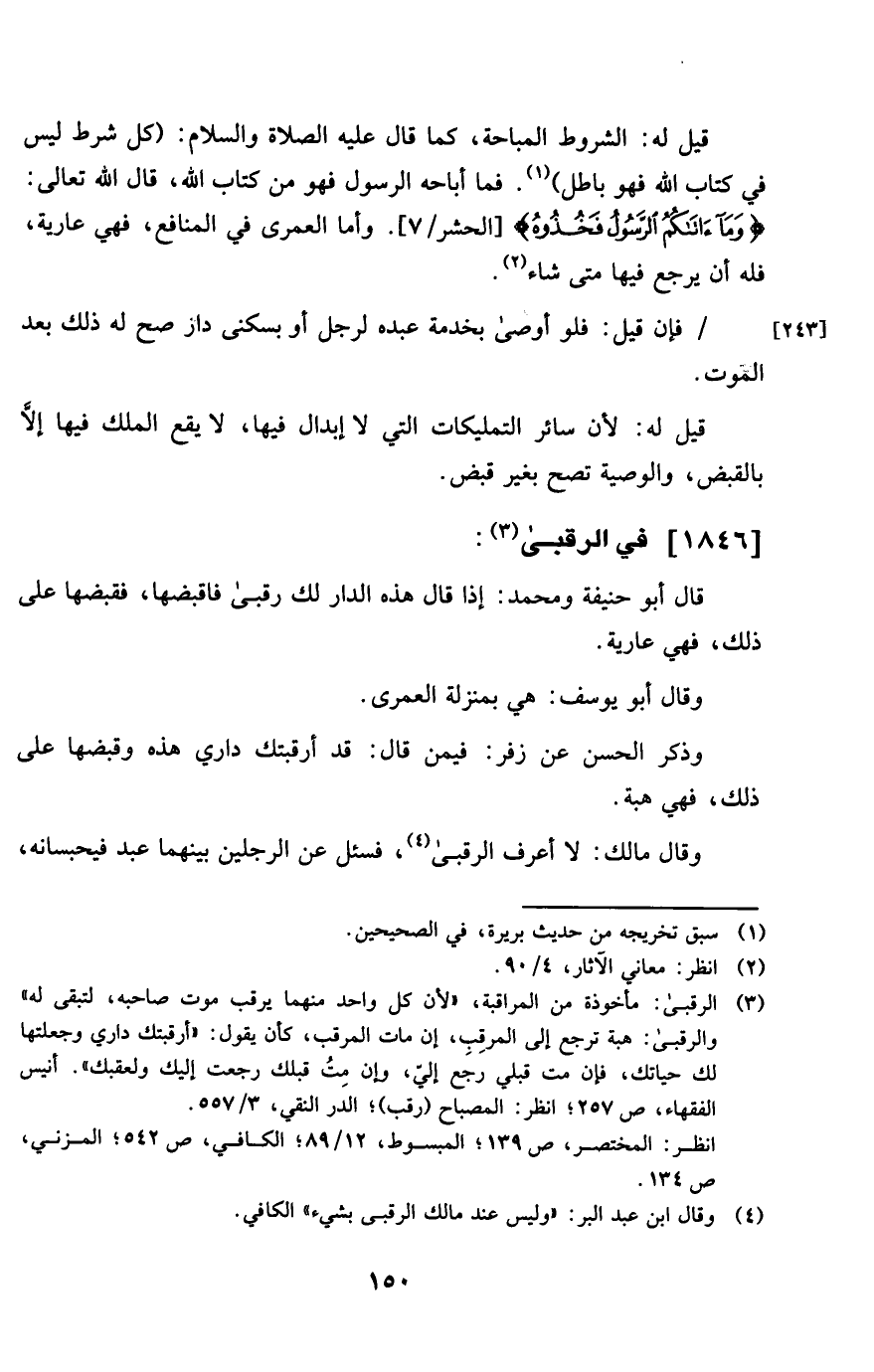 قيل لَهُ الشُّرُوط الْمُبَاحَة كَمَا قَالَ عَلَيْهِ الصَّلَاة وَالسَّلَام كل شَرط لَيْسَ فِي كتاب الله فَهُوَ بَاطِل فَمَا أَبَاحَهُ الرَّسُول فَهُوَ من كتاب الله قَالَ الله تَعَالَى {وَمَا آتَاكُم الرَّسُول فَخُذُوهُ} وَأما الْعُمْرَى فِي الْمَنَافِع فَهِيَ عَارِية فَلهُ أَن يرجع فِيهَا مَتى شَاءَ
