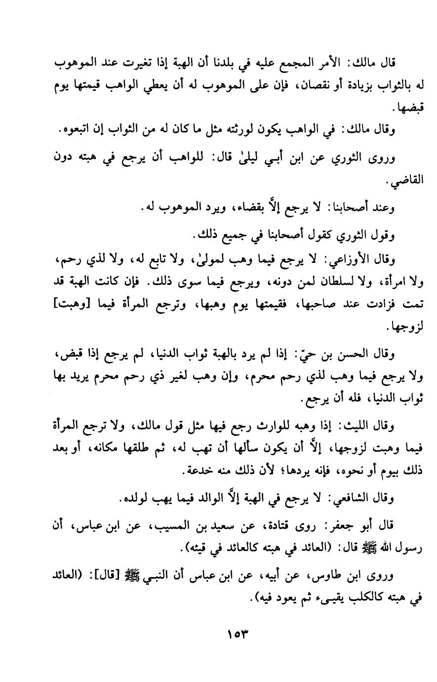 وَقَالَ الْحسن بن حَيّ إِذا لم يرد بِالْهبةِ ثَوَاب الدُّنْيَا لم يرجع إِذا قبض وَلَا يرجع فِيمَا وهب لذِي رحم محرم وَإِن وهب لغير ذِي رحم محرم يُرِيد بهَا ثَوَاب الدُّنْيَا فَلهُ أَن يرجع