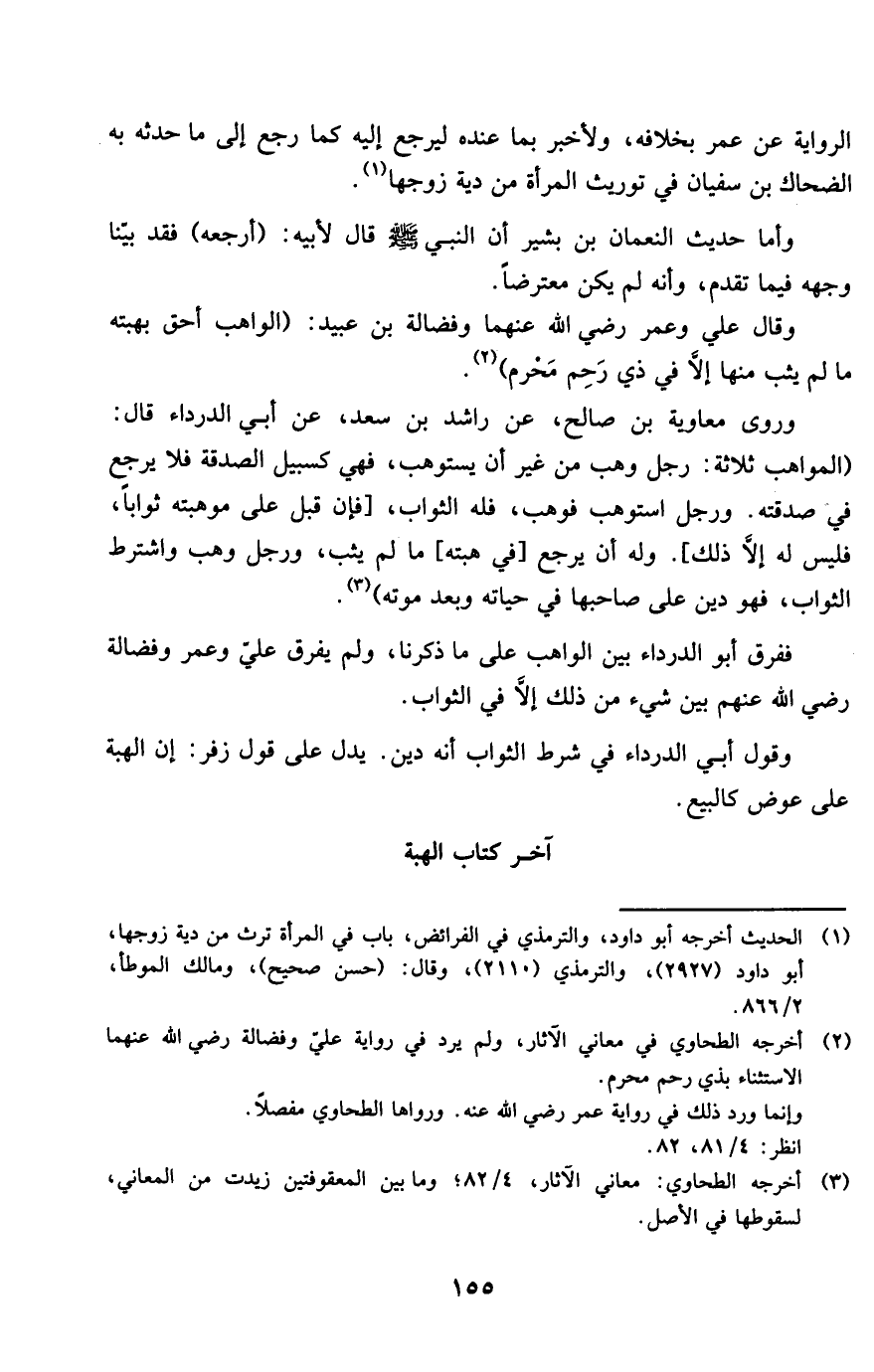 فَفرق أَبُو الدَّرْدَاء بَين الْوَاهِب على مَا ذكرنَا وَلم يفرق عَليّ وَعمر وفضالة رَضِي الله عَنْهُم بَين شَيْء من ذَلِك إِلَّا فِي الثَّوَاب
