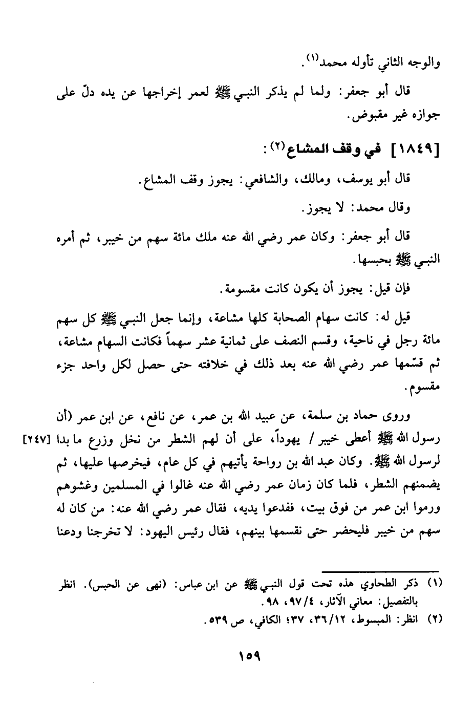 قَالَ أَبُو جَعْفَر وَكَانَ عمر رَضِي الله عَنهُ ملك مائَة سهم من خَيْبَر ثمَّ أمره النَّبِي صلى الله عَلَيْهِ وَسلم بحبسها