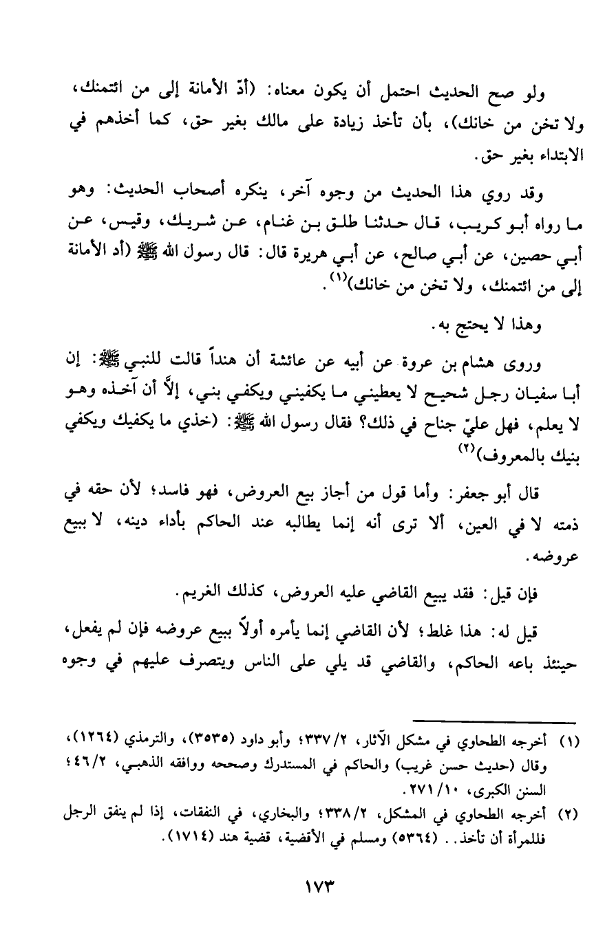 وروى هِشَام بن عُرْوَة عَن أَبِيه عَن عَائِشَة أَن هندا قَالَت للنَّبِي صلى الله عَلَيْهِ وَسلم إِن أَبَا سُفْيَان رجل شحيح لَا يعطيني مَا يَكْفِينِي وَيَكْفِي بني إِلَّا أَن آخذه وَهُوَ لَا يعلم فَهَل عَليّ جنَاح فِي ذَلِك فَقَالَ رَسُول الله صلى الله عَلَيْهِ وَسلم خذي مَا يَكْفِيك وَيَكْفِي بنيك بِالْمَعْرُوفِ