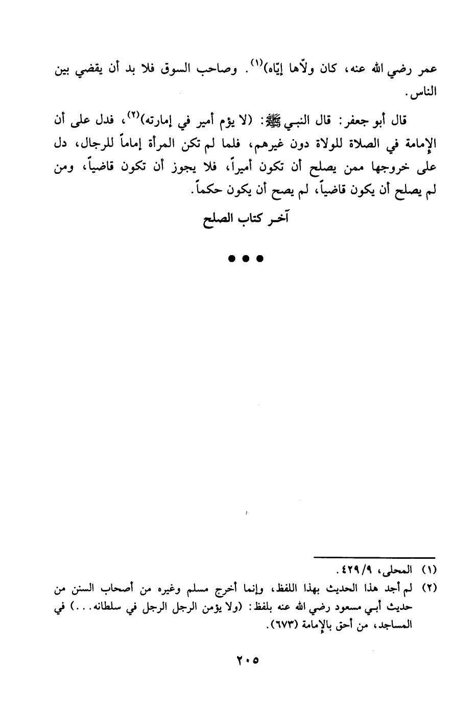 قَالَ أَبُو جَعْفَر قَالَ النَّبِي صلى الله عَلَيْهِ وَسلم لَا يؤم أَمِير فِي إمارته فَدلَّ على أَن الْإِمَامَة فِي الصَّلَاة للولاة دون غَيرهم فَلَمَّا لم تكن الْمَرْأَة إِمَامًا للرِّجَال دلّ على خُرُوجهَا مِمَّن يصلح أَن تكون أَمِيرا فَلَا يجوز أَن تكون قَاضِيا وَمن لم يصلح أَن يكون قَاضِيا لم يَصح أَن يكون حكما