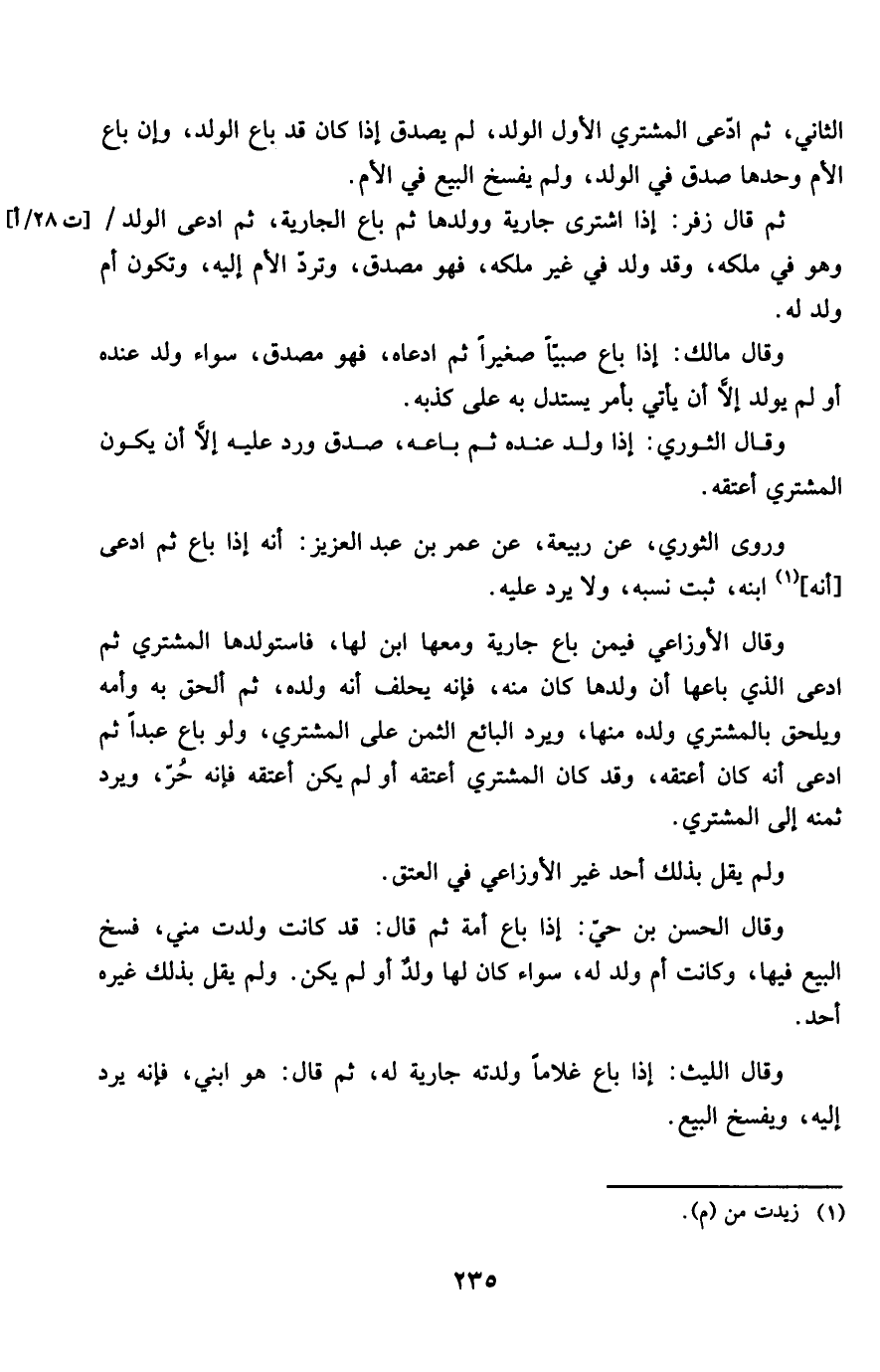 وَقَالَ الثَّوْريّ إِذا ولد عِنْده ثمَّ بَاعه صدق ورد عَلَيْهِ إِلَّا أَن يكون المُشْتَرِي أعْتقهُ