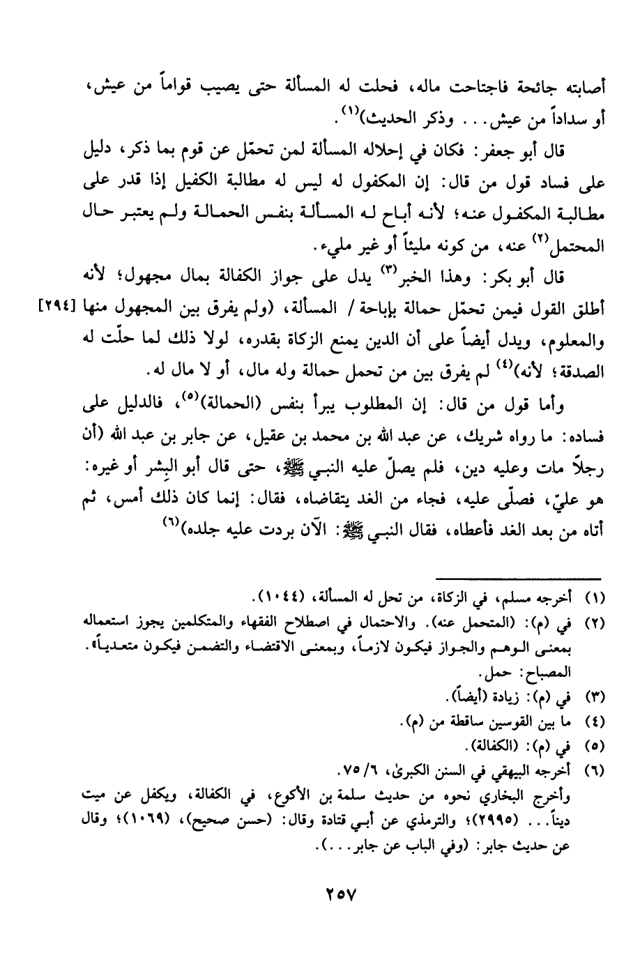 قَالَ أَبُو بكر وَهَذَا الْخَبَر يدل على جَوَاز الْكفَالَة بِمَال مَجْهُول لِأَنَّهُ أطلق القَوْل فِيمَن تحمل حمالَة بِإِبَاحَة الْمَسْأَلَة وَلم يفرق بَين الْمَجْهُول مِنْهَا والمعلوم وَيدل أَيْضا على أَن الدّين يمْنَع الزَّكَاة بِقَدرِهِ لَوْلَا ذَلِك لما حلت لَهُ الصَّدَقَة لِأَنَّهُ لم يفرق بَين من تحمل حمالَة وَله مَال أَو لَا مَال لَهُ
