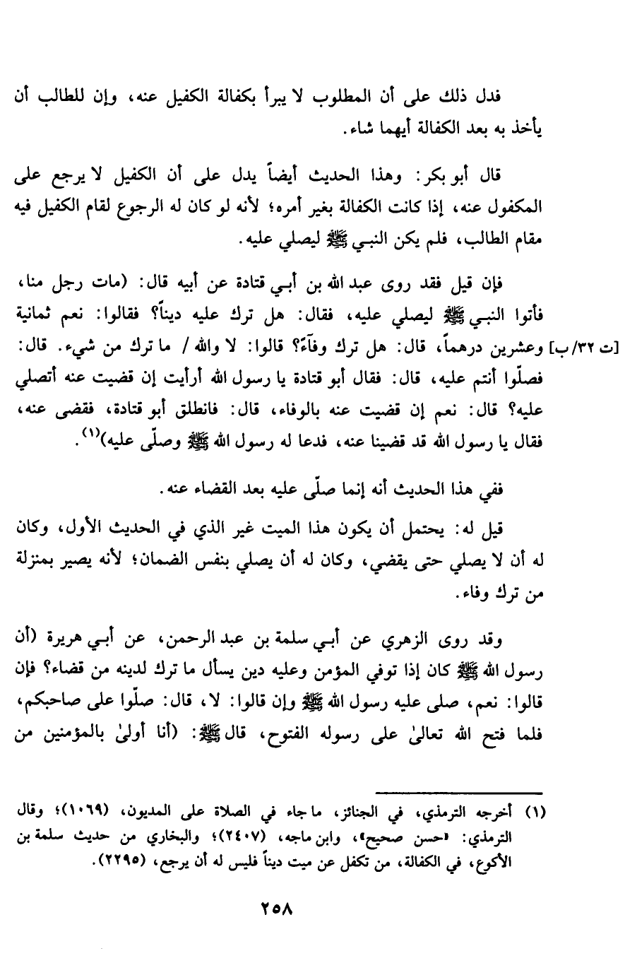 قَالَ أَبُو بكر وَهَذَا الحَدِيث أَيْضا يدل على أَن الْكَفِيل لَا يرجع على الْمَكْفُول عَنهُ إِذا كَانَت لكفالة بِغَيْر أَمر لِأَنَّهُ لَو كَانَ لَهُ الرُّجُوع لقام الْكَفِيل فِيهِ مقَام الطَّالِب فَلم يكن النَّبِي صلى الله عَلَيْهِ وَسلم ليُصَلِّي عَلَيْهِ