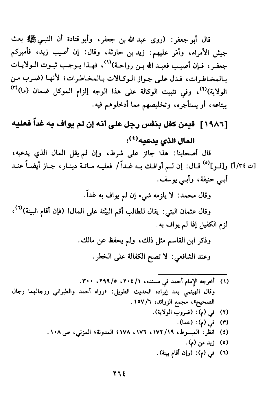 قَالَ أَبُو جَعْفَر روى عبد لله بن جَعْفَر وَأَبُو قَتَادَة أَن النَّبِي صلى الله عَلَيْهِ وَسلم بعث جَيش الْأُمَرَاء وَأمر عَلَيْهِم زيد بن حَارِثَة وَقَالَ إِن أُصِيب زيد فأميركم جَعْفَر فَإِن أُصِيب فعبد الله بن رَوَاحَة فَهَذَا يُوجب ثُبُوت الولايات بالمخاطرات فَدلَّ على جَوَاز الوكالات بالمخاطرات لِأَنَّهَا ضرب من الْولَايَة وَفِي تثبيت الْوكَالَة على هَذَا الْوَجْه إِلْزَام الْمُوكل ضَمَان مَا يبتاعه أَو يستأجره وتخليصهم مِمَّا أدخلولهم فِيهِ