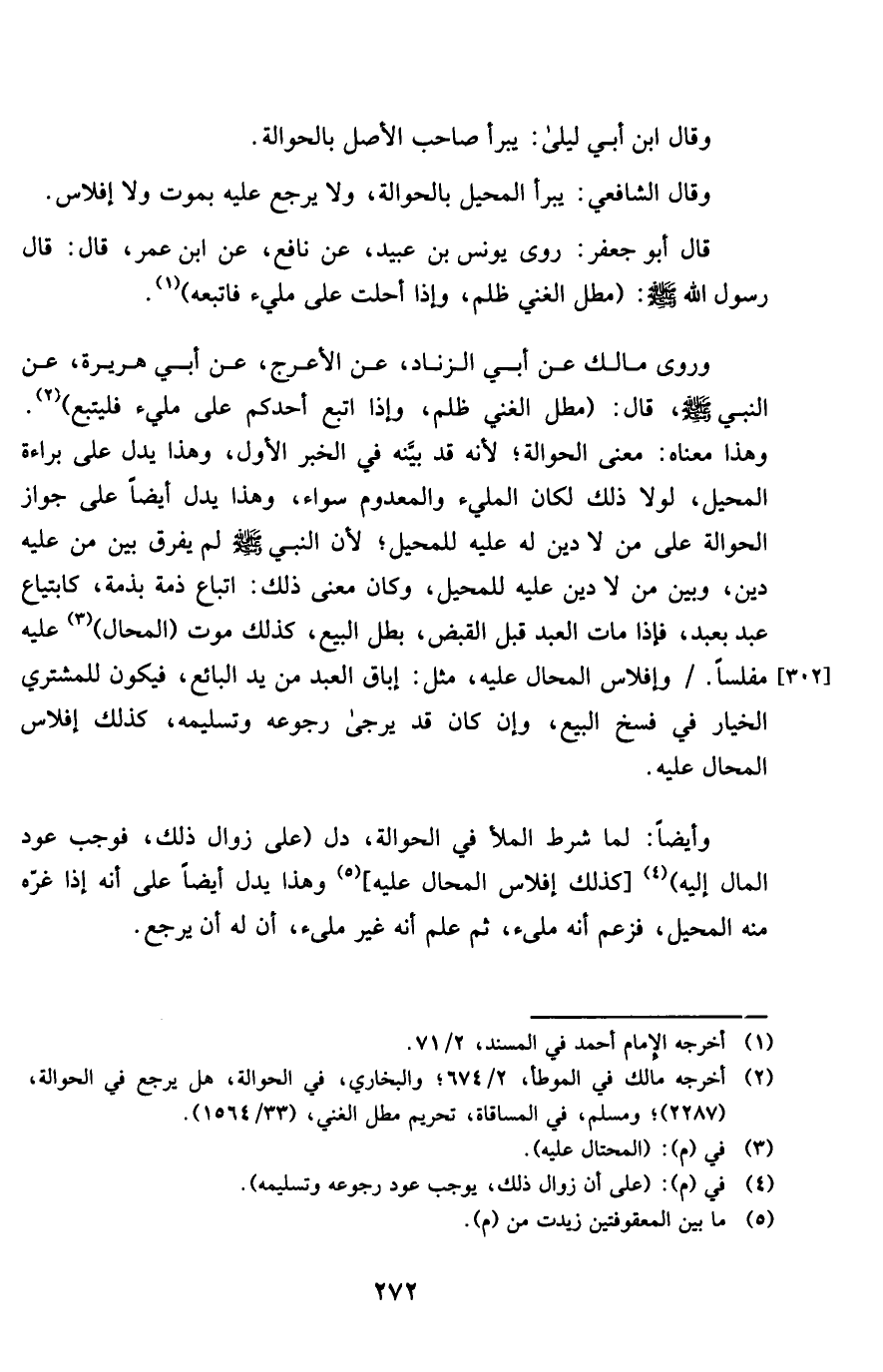 وروى مَالك عَن أبي الزِّنَاد عَن الْأَعْرَج عَن أبي هُرَيْرَة عَن النَّبِي صلى الله عَلَيْهِ وَسلم قَالَ مطل الْغَنِيّ ظلم وَإِذا اتبع أحدكُم على مَلِيء فَليتبعْ وَهَذَا مَعْنَاهُ معنى الْحِوَالَة لِأَنَّهُ قد بَينه فِي الْخَبَر الأول وَهَذَا يدل على بَرَاءَة الْمُحِيل لَوْلَا ذَلِك لَكَانَ المليء والمعدوم سَوَاء وَهَذَا يدل أَيْضا على جَوَاز الْحِوَالَة على من لَا دين لَهُ عَلَيْهِ للْمُحِيل لِأَن النَّبِي صلى الله عَلَيْهِ وَسلم لم يفرق بَين من عَلَيْهِ دين وَبَين من لَا دين عَلَيْهِ للْمُحِيل وَكَانَ معنى ذَلِك اتِّبَاع ذمَّة بِذِمَّة كابتياع عبد بِعَبْد فَإِذا مَاتَ العَبْد قبل الْقَبْض بَطل البيع كَذَلِك موت الْمحَال عَلَيْهِ مُفلسًا وإفلاس الْمحَال عَلَيْهِ مثل إباق العَبْد من يَد البَائِع فَيكون للْمُشْتَرِي الْخِيَار فِي فسخ البيع وَإِن كَانَ قد يُرْجَى رُجُوعه وتسليمه كَذَلِك إفلاس الْمحَال عَلَيْهِ