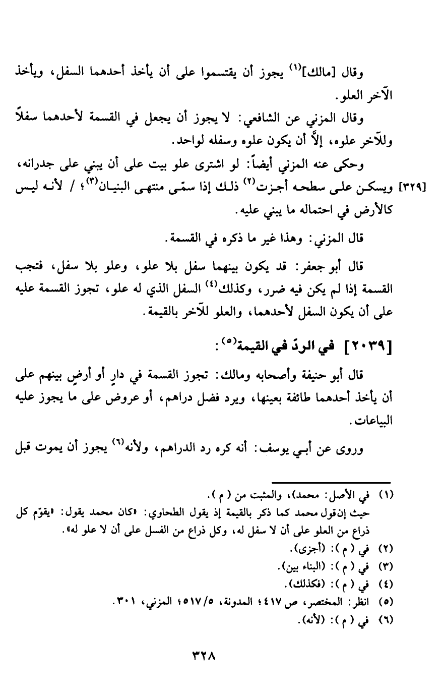 وَقَالَ الْمُزنِيّ عَن الشَّافِعِي لَا يجوز أَن يَجْعَل فِي الْقِسْمَة لأَحَدهمَا سفلا وَللْآخر علوه إِلَّا أَن يكون علوه وسفله لوَاحِد