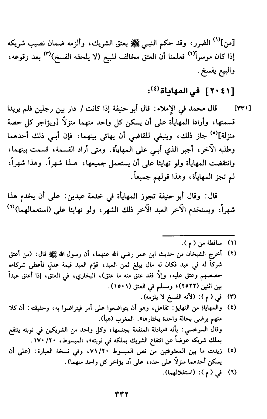 قَالَ وَقَالَ أَبُو حنيفَة تجوز الْمُهَايَأَة فِي خدمَة عَبْدَيْنِ على أَن يخْدم هَذَا شهرا ويستخدم الآخر العَبْد الآخر ذَلِك الشَّهْر وَلَو تهايئا على استعمالهما