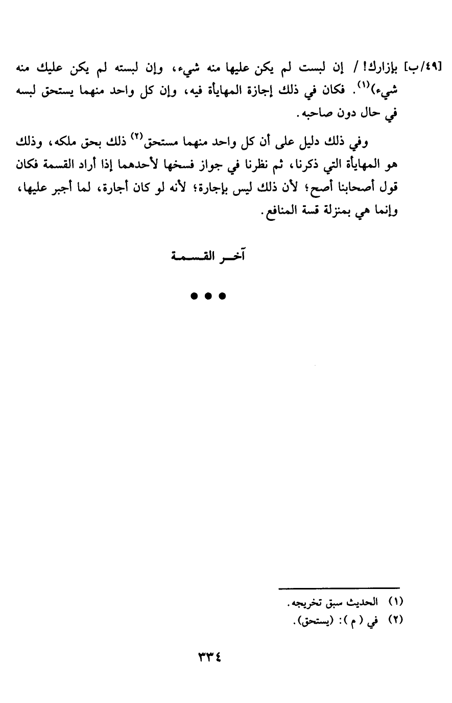 بإزارك إِن لبست لم يكن عَلَيْهَا مِنْهُ شَيْء وَإِن لبسته لم يكن عَلَيْك مِنْهُ شَيْء فَكَانَ فِي ذَلِك إجَازَة الْمُهَايَأَة فِيهِ وَإِن كل وَاحِد مِنْهُمَا يسْتَحق لبسه فِي حَال دون صَاحبه