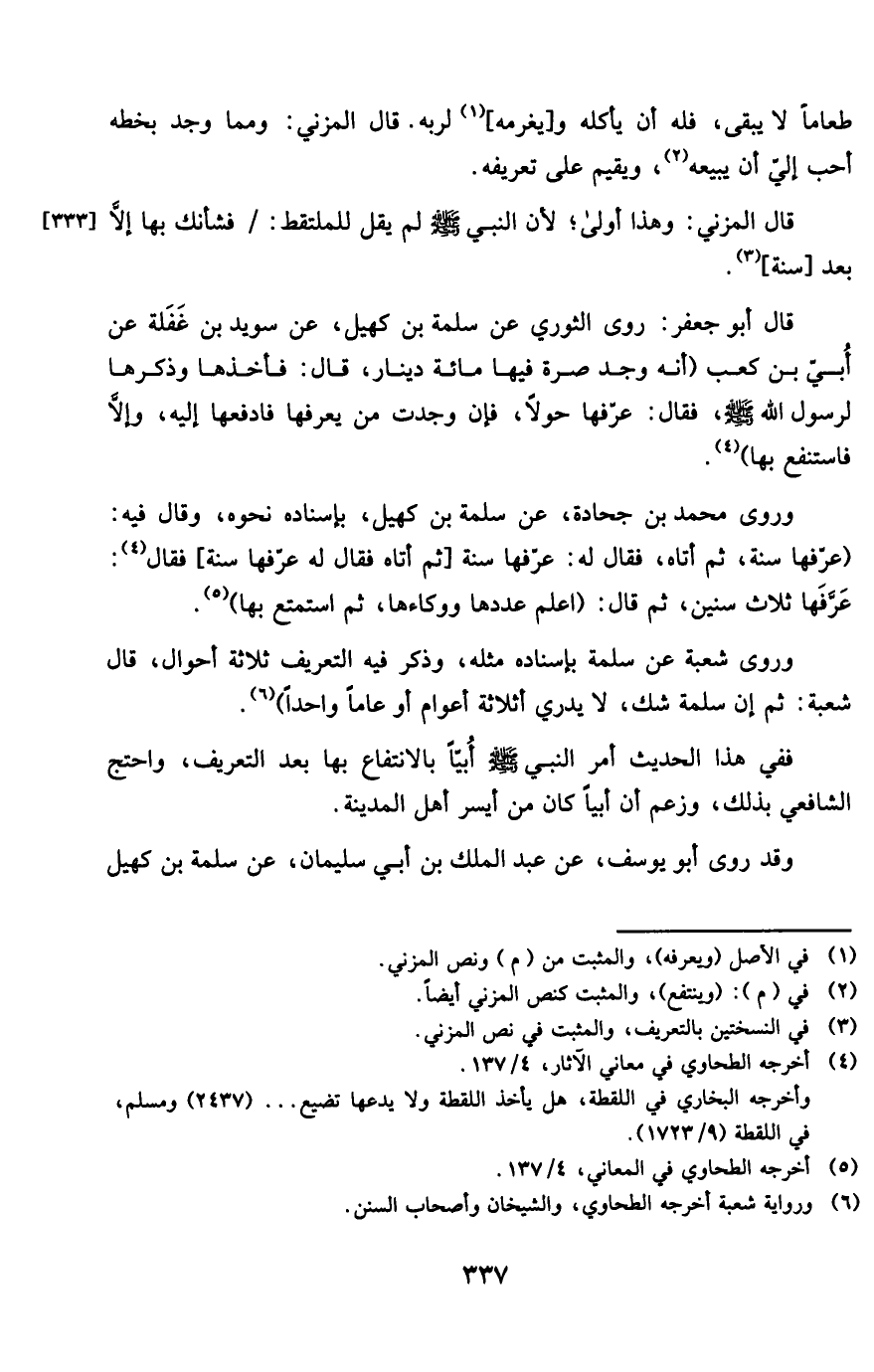 قَالَ أَبُو جَعْفَر روى الثَّوْريّ عَن سَلمَة بن كهيل عَن سُوَيْد بن غَفلَة عَن أبي بن كَعْب أَنه وجد صرة فِيهَا مائَة دِينَار قَالَ فَأَخذهَا وَذكرهَا لرَسُول الله صلى الله عَلَيْهِ وَسلم فَقَالَ عرفهَا حولا فَإِن وجدت من يعرفهَا فادفعها إِلَيْهِ وَإِلَّا فاستنفع بهَا