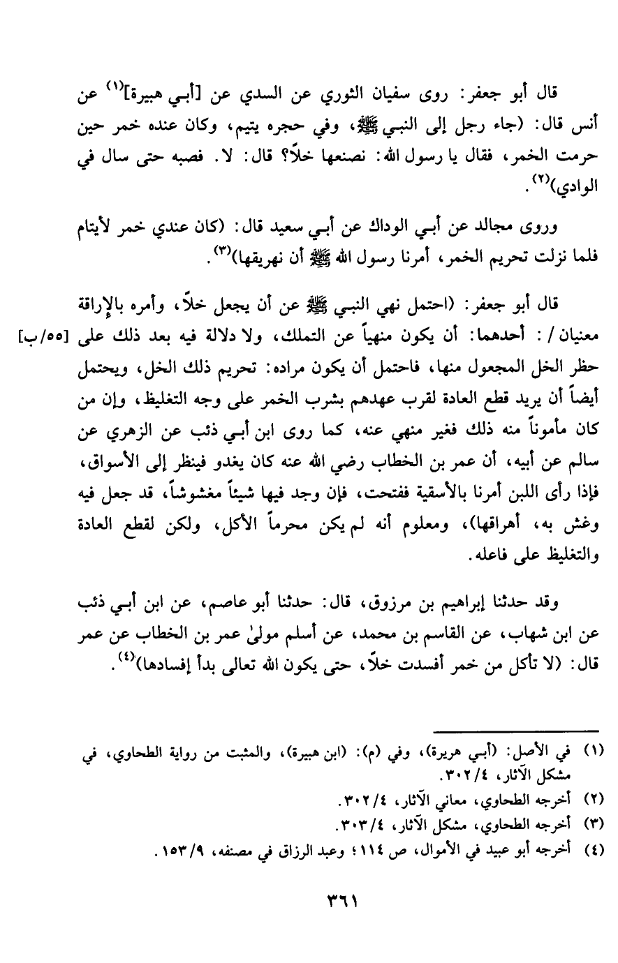 قَالَ أَبُو جَعْفَر روى سُفْيَان الثَّوْريّ عَن السّديّ عَن أبي هُبَيْرَة عَن أنس قَالَ جَاءَ رجل إِلَى النَّبِي صلى الله عَلَيْهِ وَسلم وَفِي حجره يتم وَكَانَ عِنْده خمر حِين حرمت الْخمر فَقَالَ يَا رَسُول الله نصنعها خلا قَالَ لَا فَصَبَّهُ حَتَّى سَالَ فِي الْوَادي