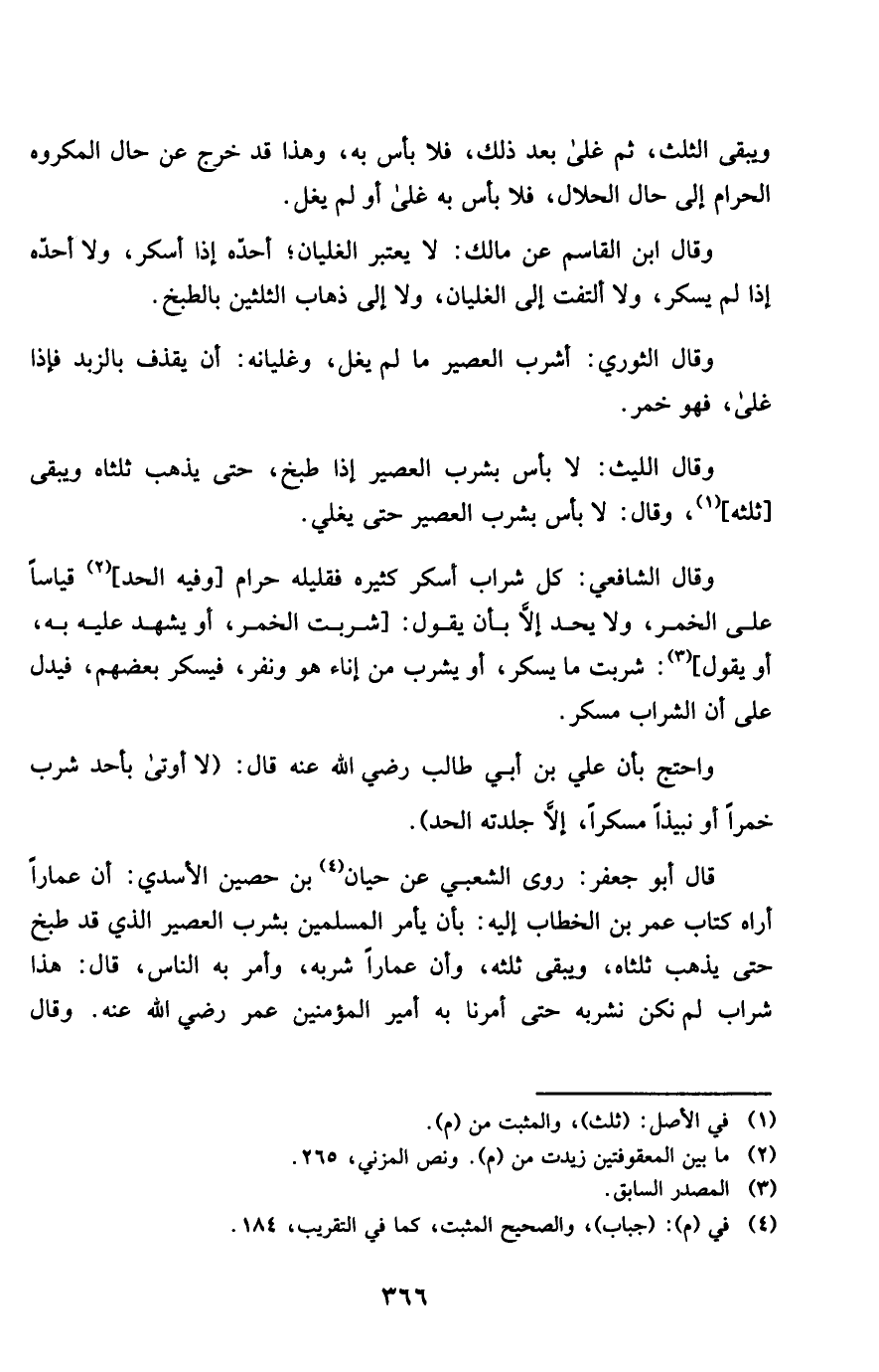 قَالَ أَبُو جَعْفَر روى الشّعبِيّ عَن حَيَّان بن حُصَيْن الْأَسدي أَن عمارا أرَاهُ كتاب عمر بن الْخطاب إِلَيْهِ بِأَن يَأْمر الْمُسلمين بِشرب الْعصير الَّذِي قد طبخ حَتَّى يذهب ثُلُثَاهُ وَيبقى ثلثه وَأَن عمارا شربه وَأمر بِهِ النَّاس قَالَ هَذَا شراب لم نَكُنْ نشربه حَتَّى أمرنَا بِهِ أَمِير الْمُؤمنِينَ عمر رَضِي الله عَنهُ وَقَالَ
