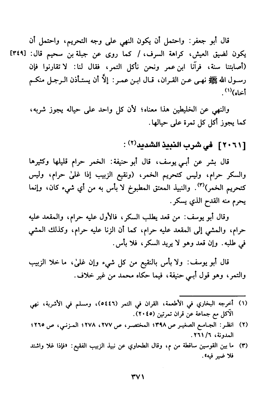 قَالَ أَبُو جَعْفَر وَاحْتمل أَن يكون النَّهْي على وَجه التَّحْرِيم وَاحْتمل أَن يكون لضيف الْعَيْش كَرَاهَة السَّرف كَمَا روى عَن جبلة بن سحيم قَالَ أصابتنا سنة فرآنا ابْن عمر وَنحن نَأْكُل التَّمْر فَقَالَ لنا لَا تقارنوا فَإِن رَسُول الله صلى الله عَلَيْهِ وَسلم نهى عَن الْقرَان قَالَ ابْن عمر إِلَّا أَن يسْتَأْذن الرجل مِنْكُم أَخَاهُ