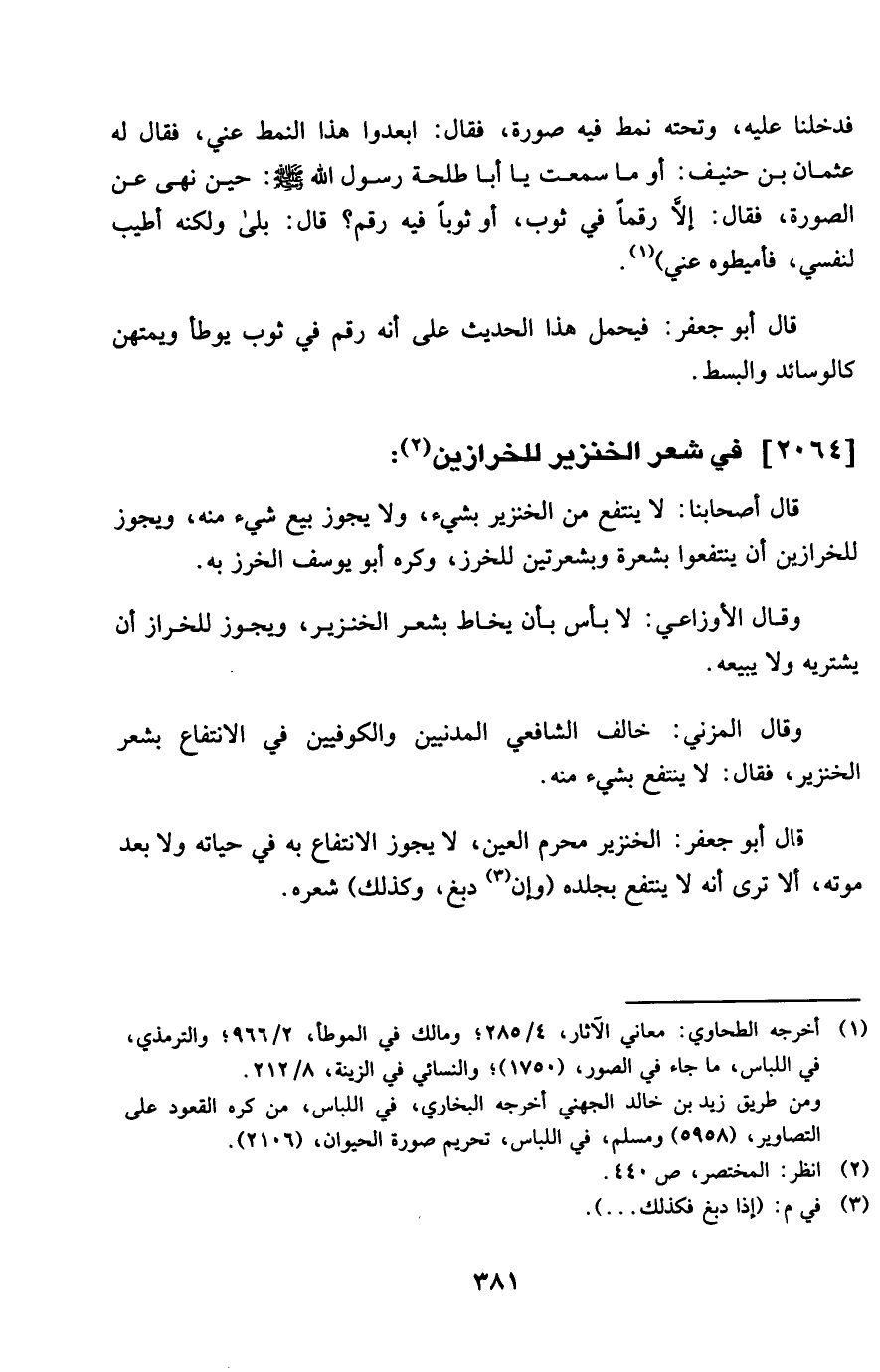 قَالَ أَبُو جَعْفَر الْخِنْزِير محرم الْعين لَا يجوز الِانْتِفَاع بِهِ فِي حَيَاته وَلَا بعد مَوته أَلا ترى أَنه لَا ينْتَفع بجلده وَإِن دبغ وَكَذَلِكَ شعره