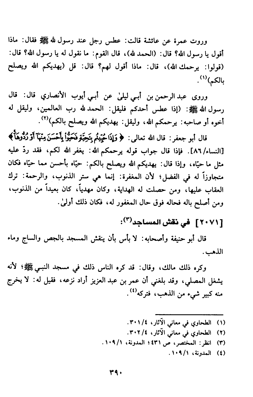 قَالَ أَبُو جَعْفَر قَالَ الله تَعَالَى {وَإِذا حييتُمْ بِتَحِيَّة فَحَيوا بِأَحْسَن مِنْهَا أَو ردوهَا} فَإِذا قَالَ جَوَاب قَوْله يَرْحَمكُمْ الله يغْفر الله لكم فقد رد عَلَيْهِ مثل مَا حَيَّاهُ وَإِذا قَالَ يهديكم الله وَيصْلح بالكم حَيَّاهُ بِأَحْسَن مِمَّا حَيَّاهُ فَكَانَ متجاوزا لَهُ فِي الْفضل لِأَن الْمَغْفِرَة إِنَّمَا هِيَ ستر الذُّنُوب وَالرَّحْمَة ترك الْعقَاب عَلَيْهَا وَمن حصلت لَهُ الْهِدَايَة وَكَانَ مهديا كَانَ بَعيدا من الذُّنُوب وَمن أصلح باله فحاله فَوق حَال المغفور لَهُ فَكَانَ ذَلِك أولى