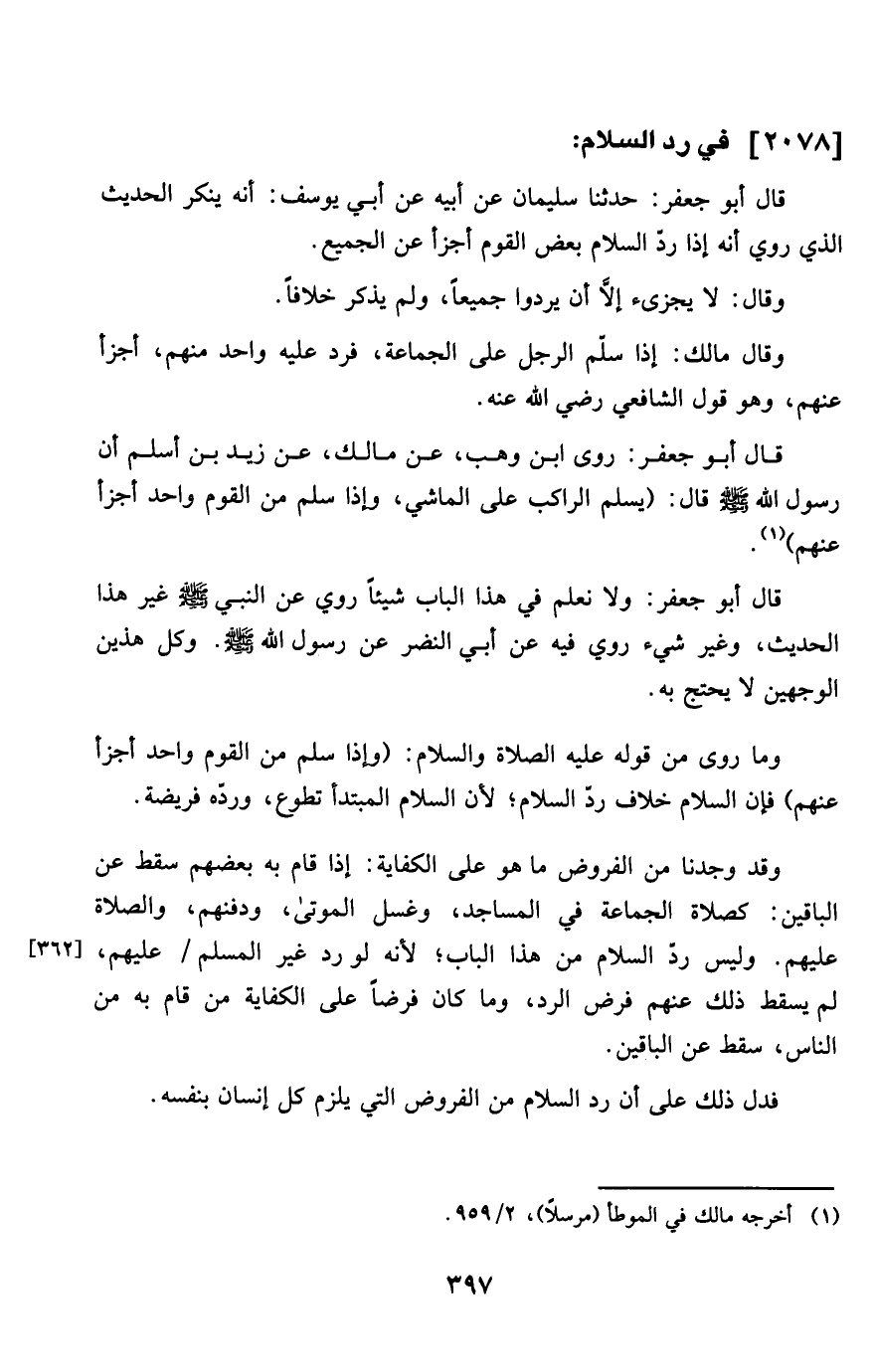 قَالَ أَبُو جَعْفَر روى ابْن وهب عَن مَالك عَن زيد بن أسلم أَن رَسُول الله صلى الله عَلَيْهِ وَسلم قَالَ يسلم الرَّاكِب على الْمَاشِي وَإِذا سلم من الْقَوْم وَاحِد أَجْزَأَ عَنْهُم