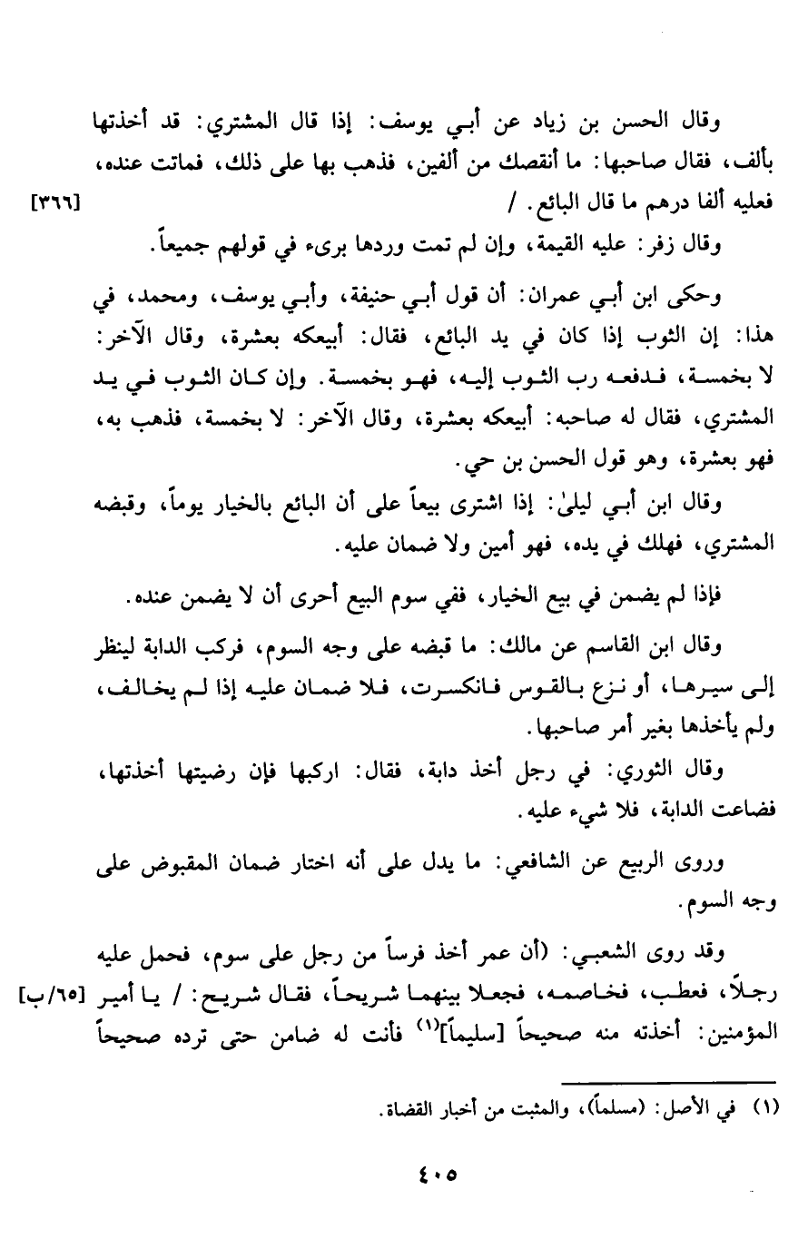 وَقد روى الشّعبِيّ أَن عمر أَخذ فرسا من رجل على سوم فَحمل عَلَيْهِ رجلا فَعَطب فخاصمه فَجعلَا بَينهمَا شريحا فَقَالَ شُرَيْح يَا أَمِير الْمُؤمنِينَ أَخَذته مِنْهُ صَحِيحا سليما فَأَنت لَهُ ضَامِن حَتَّى ترده صَحِيحا