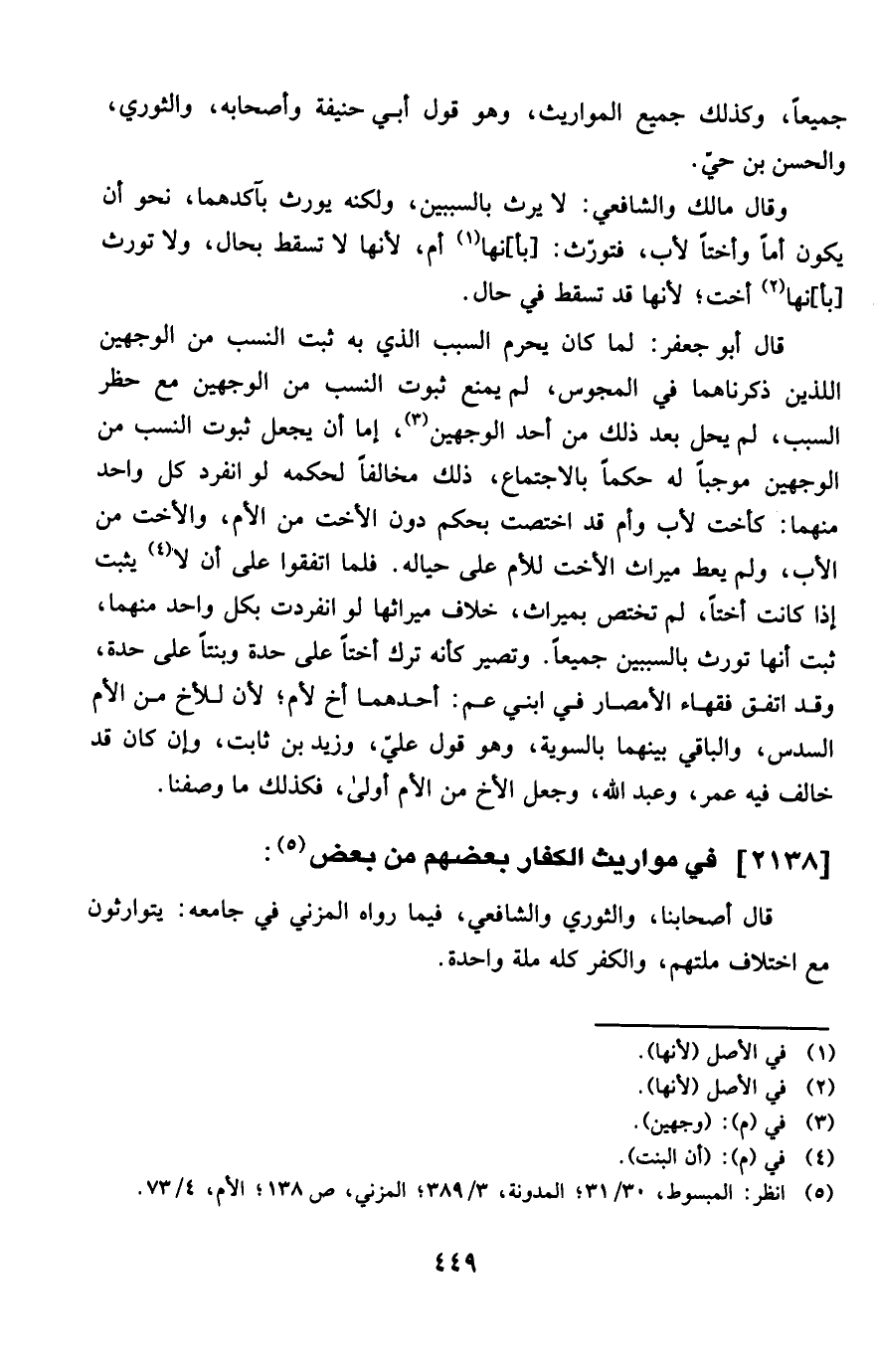 قَالَ أَبُو جَعْفَر لما كَانَ يحرم السَّبَب الَّذِي بِهِ ثَبت النّسَب من الْوَجْهَيْنِ اللَّذين ذكرناهما فِي الْمَجُوس لم يمْنَع ثُبُوت النّسَب من الْوَجْهَيْنِ مَعَ حظر السَّبَب لم يحل بعد ذَلِك من أحد الْوَجْهَيْنِ إِمَّا أَن يَجْعَل ثُبُوت النّسَب من الْوَجْهَيْنِ مُوجبا لَهُ حكما بالاجتماع ذَلِك مُخَالفا لحكمه لَو انْفَرد كل وَاحِد مِنْهُمَا كأخت لأَب وَأم قد اخْتصّت بِحكم دون الْأُخْت من الْأُم وَالْأُخْت من الْأَب وَلم ععط مِيرَاث الْأُخْت للْأُم على حياله فَلَمَّا اتَّفقُوا على أَن لَا يثبت إِذا كَانَت أُخْتا لم تخْتَص بميراث خلاف مِيرَاثهَا لَو انْفَرَدت بِكُل وَاحِدَة مِنْهُمَا ثَبت أَنَّهَا تورث بالسببين جَمِيعًا وَتصير كَأَنَّهُ ترك أُخْتا على حِدة وبنتا على حِدة وَقد اتّفق فُقَهَاء الْأَمْصَار فِي ابْني عَم أَحدهمَا أَخ لأم لِأَن للْأَخ من الْأُم السُّدس وَالْبَاقِي بَينهمَا بِالسَّوِيَّةِ وهوقول عَليّ وَزيد بن ثَابت وَإِن كَانَ قد خَالف فِيهِ عمر وَعبد الله وَجعل الْأَخ من الْأُم أولى فَكَذَلِك مَا وَصفنَا