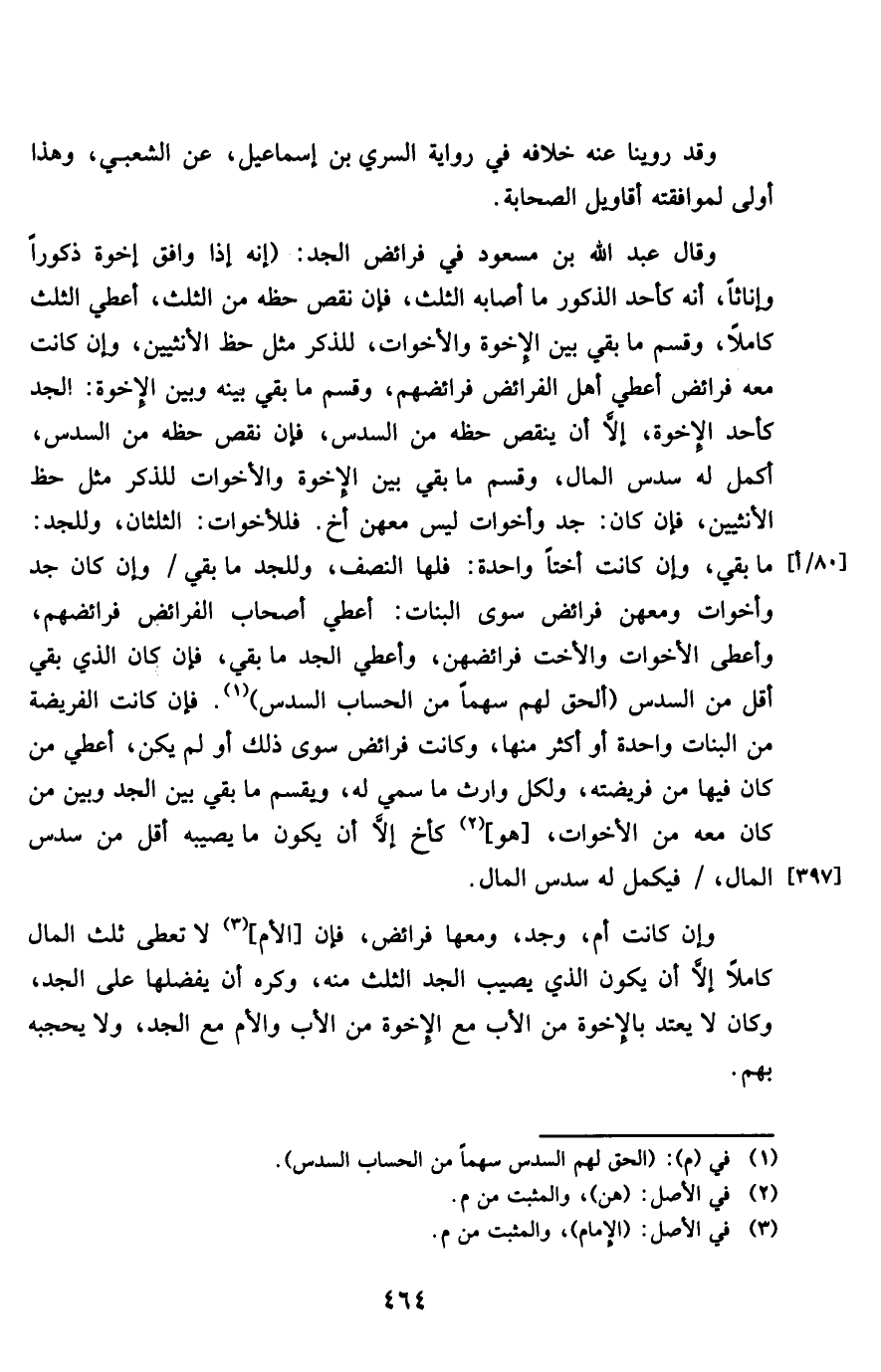 وَقَالَ عبد الله بن مَسْعُود فِي فَرَائض الْجد إِنَّه إِذا وَافق إخْوَة ذُكُورا وإناثا أَنه كَأحد الذُّكُور مَا أَصَابَهُ الثُّلُث فَإِن نقص حَظه من الثُّلُث أعطي الثُّلُث كَامِلا وَقسم مَا بَقِي بَين الْإِخْوَة وَالْأَخَوَات للذّكر مثل حَظّ الْأُنْثَيَيْنِ وَإِن كَانَت مَعَه فَرَائض أعطي أهل الْفَرَائِض فرائضهم وَقسم مَا بَقِي بَينه وَبَين الْإِخْوَة الْجد كَأحد الْإِخْوَة إِلَّا أَن ينقص حَظه من السُّدس فَإِن نقص حَظه من السُّدس أكمل لَهُ سدس المَال وَقسم مَا بَقِي بَين الْإِخْوَة وَالْأَخَوَات للذّكر مثل حَظّ الْأُنْثَيَيْنِ فَإِن كَانَ جد وأخوات لَيْسَ مَعَهُنَّ أَخ فللأخوات الثُّلُثَانِ وللجد مَا بَقِي وَإِن كَانَت أُخْتا وَاحِدَة فلهَا النّصْف وللجد مَا بَقِي وَإِن كَانَ جد وأخوات ومعهن فَرَائض سوى الْبَنَات أعطي أَصْحَاب الْفَرَائِض فرائضهم وَأعْطى الْأَخَوَات وَالْأُخْت فرائضهن وَأعْطِي الْجد مَا بَقِي فَإِن كَانَ الَّذِي بَقِي أقل من السُّدس ألحق لَهُم سَهْما من الْحساب السُّدس فَإِن كَانَت الْفَرِيضَة من الْبَنَات وَاحِدَة أَو أَكثر مِنْهَا وَكَانَت فَرَائض سوى ذَلِك أَو لم يكن أعطي من كَانَ فِيهَا من فريضته وَلكُل وَارِث مَا سمي لَهُ وَيقسم مَا بَقِي بَين الْجد وَبَين من كَانَ مَعَه من الْأَخَوَات هُوَ كأخ إِلَّا أَن يكون مَا يُصِيبهُ أقل من سدس المَال فيكمل لَهُ سدس المَال