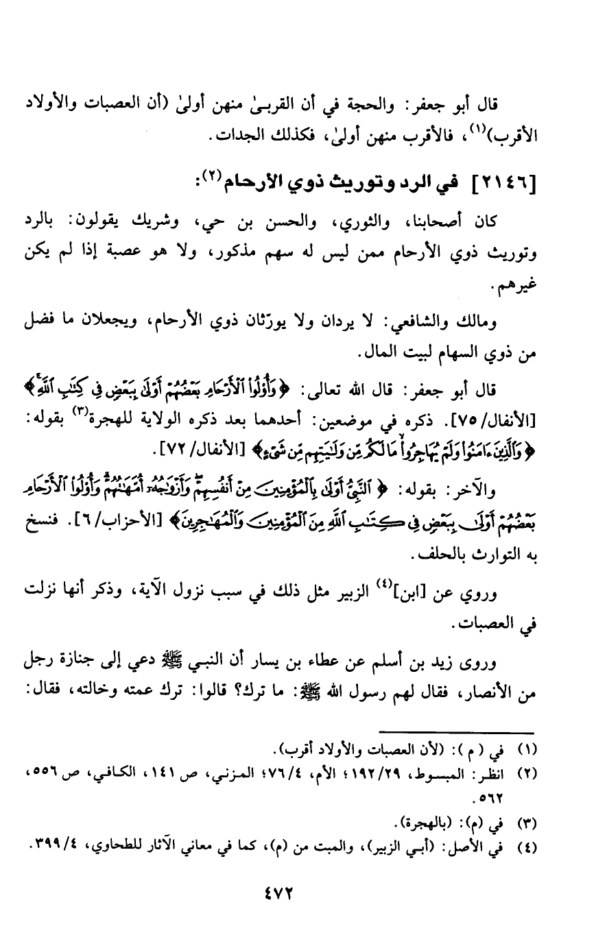 قَالَ أَبُو جَعْفَر قَالَ الله تَعَالَى {وأولو الْأَرْحَام بَعضهم أولى بِبَعْض فِي كتاب الله} ذكره فِي موضِعين أَحدهمَا بعد ذكره الْولَايَة لِلْهِجْرَةِ بقوله {وَالَّذين آمنُوا وَلم يهاجروا مَا لكم من ولايتهم من شَيْء}