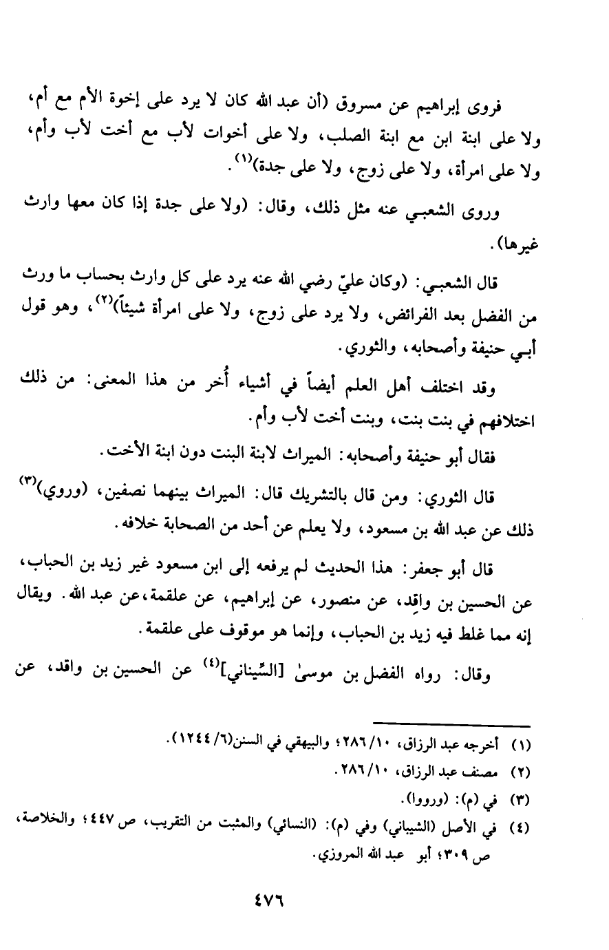 فروى إِبْرَاهِيم عَن مَسْرُوق أَن عبد الله كَانَ لَا يرد على إخْوَة الْأُم مَعَ أم وَلَا على ابْنة ابْن مَعَ ابْنة الصلب وَلَا على أَخَوَات لأَب مَعَ أُخْت لأَب وَأم وَلَا على امْرَأَة وَلَا على زوج وَلَا على جدة