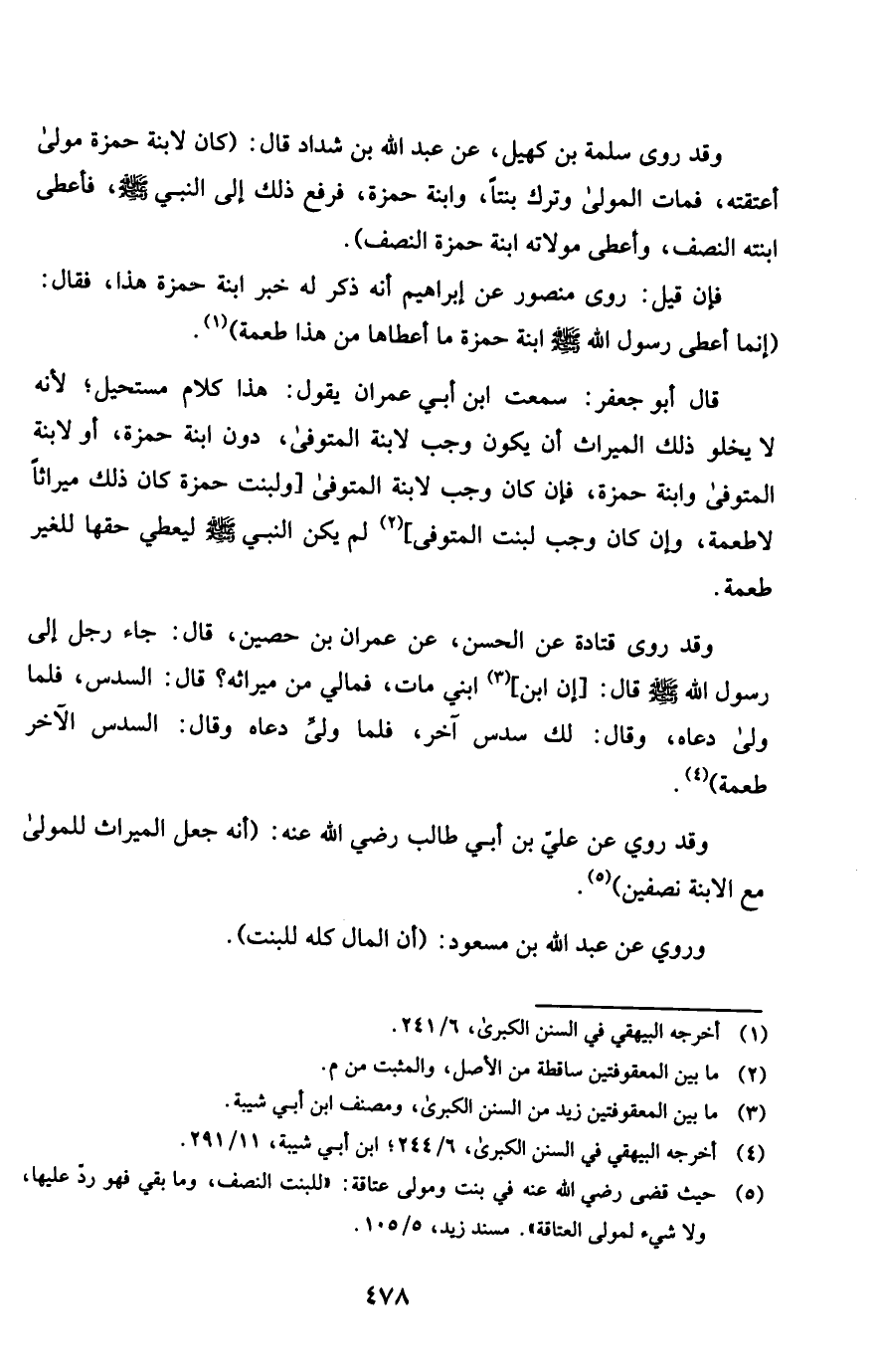 وَقد روى سَلمَة بن كهيل عَن عبد الله بن شَدَّاد قَالَ كَانَ لابنَة حَمْزَة مولى أَعتَقته فَمَاتَ الْمولى وَترك بِنْتا وَابْنَة حَمْزَة فَرفع ذَلِك إِلَى النَّبِي صلى الله عَلَيْهِ وَسلم فَأعْطى ابْنَته النّصْف وَأعْطى مولاته ابْنة حَمْزَة النّصْف
