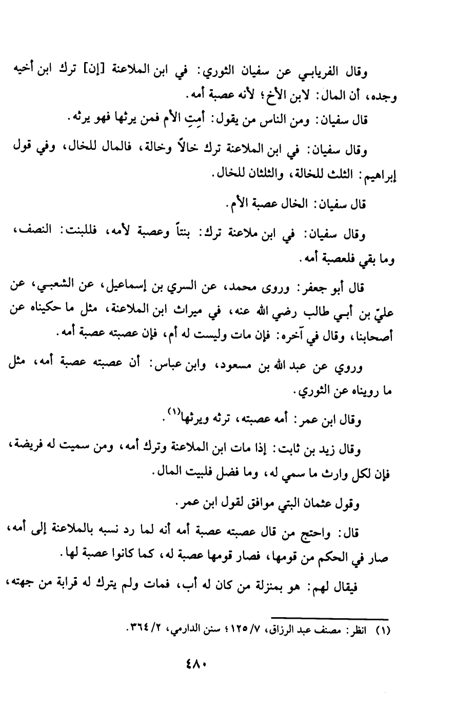 وَقَالَ الْفرْيَابِيّ عَن سُفْيَان الثَّوْريّ فِي ابْن الْمُلَاعنَة إِن ترك ابْن أَخِيه وجده أَن المَال لِابْنِ الْأَخ لِأَنَّهُ عصبَة أمه