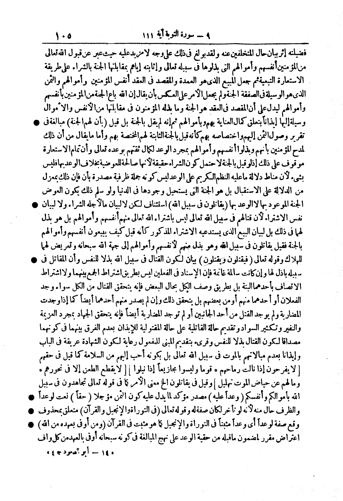 فضيلتِه إثرَ بيانِ حالِ المتخلفين عنه ولقد بولغ في ذلك على وجه لا مزيدَ عليهِ حيثُ عبّر عن قَبول الله تعالى مِنَ المؤمنين أنفسَهم وأموالَهم التي بذلوها في سبيله تعالى وإثابتِه إياهم بمقابلتها الجنةَ بالشراء على طريقة الاستعارةِ التبعية ثم جُعل المبيعُ الذي هو العُمدةُ والمقصِدُ في العقد أنفُسَ المؤمنين وأموالَهم والثمنُ الذي هو الوسيلةُ في الصفقة الجنةُ ولم يُجعل الأمرُ على العكس بأن يقال إن الله باع الجنةَ من المؤمنين بأنفسهم وأموالهم ليدل على أن المقصِد في العقد هو الجنةُ وما بذله المؤمنون في مقابلتها من الأنفس والأموال وسيلةٌ إليها إيذاناً بتعلق كمالِ العنايةِ بهم وبأموالهم ثم إنه لم يقل بالجنة بل قيل