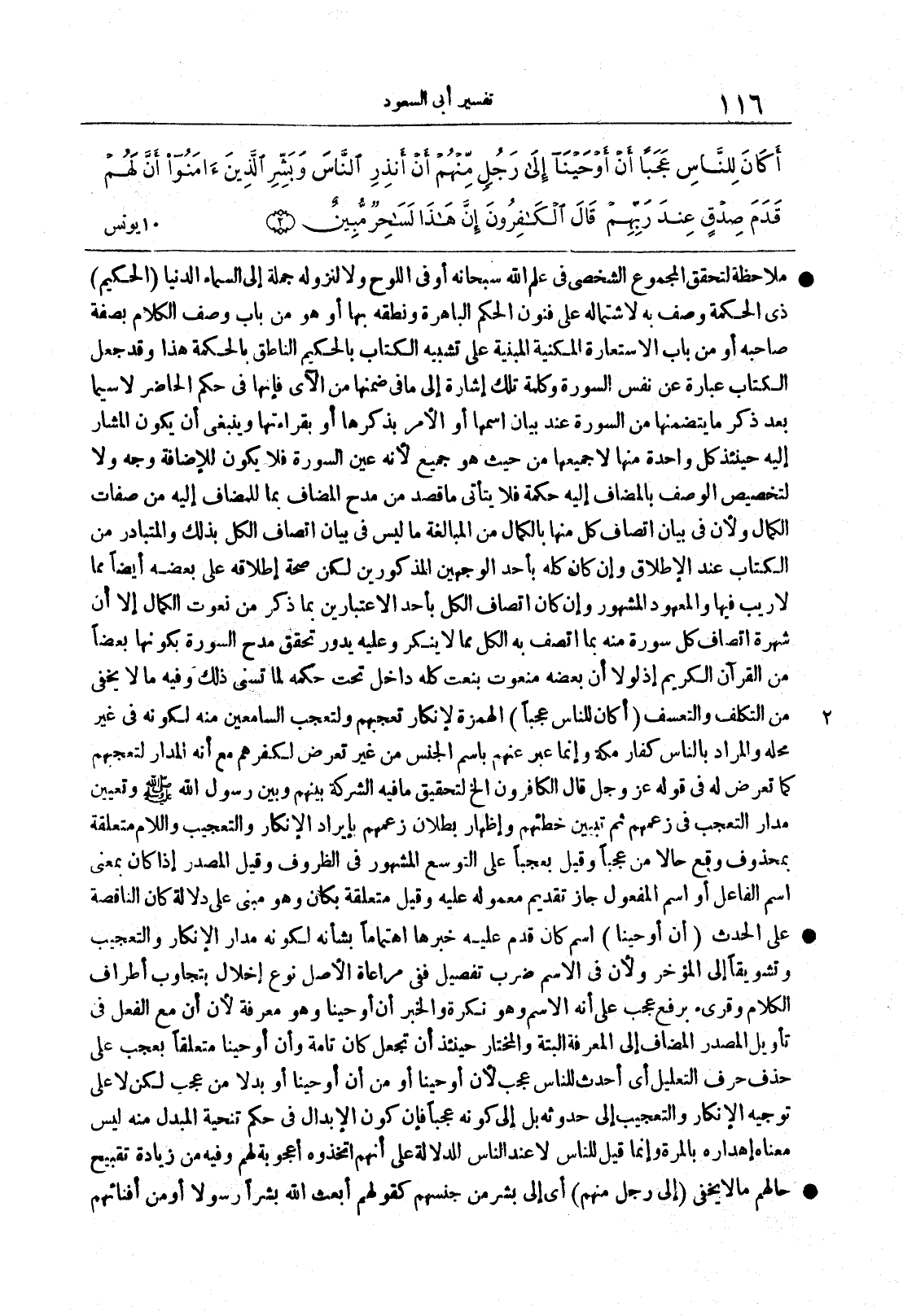 2 - {أَكَانَ لِلنَّاسِ عَجَبًا} الهمزةُ لإنكار تعجّبِهم ولتعجب السامعين منه لكونه في غير محلِّه والمرادُ بالناس كفارُ مكةَ وإنما عبِّر عنهم باسم الجِنسِ من غير تعرُّضٍ لكفرهم مع أنه المدارُ لتعجبهم كما تُعُرِّض له في قولِه عزَّ وجلَّ قَالَ الكافرون الخ لتحقيق ما فيه الشركةُ بينهم وبين رسول الله صلى الله عليه وسلم وتعيينِ مدارِ التعجبِ في زعمهم ثم تبيينِ خطئِهم وإظهارِ بطلانِ زعمِهم بإيراد الإنكارِ والتعجيب واللامُ متعلقةٌ بمحذوفٍ وقعَ حالاً من عجباً وقيل بعجباً على التوسع المشهورِ في الظروف وقيل المصدرُ إذا كان بمعنى اسم الفاعلِ أو اسمِ المفعول جاز تقديمُ معمولِه عليه وقيل متعلقةٌ بكان وهو مبنيٌّ على دلالة كان الناقصةِ على الحدث
