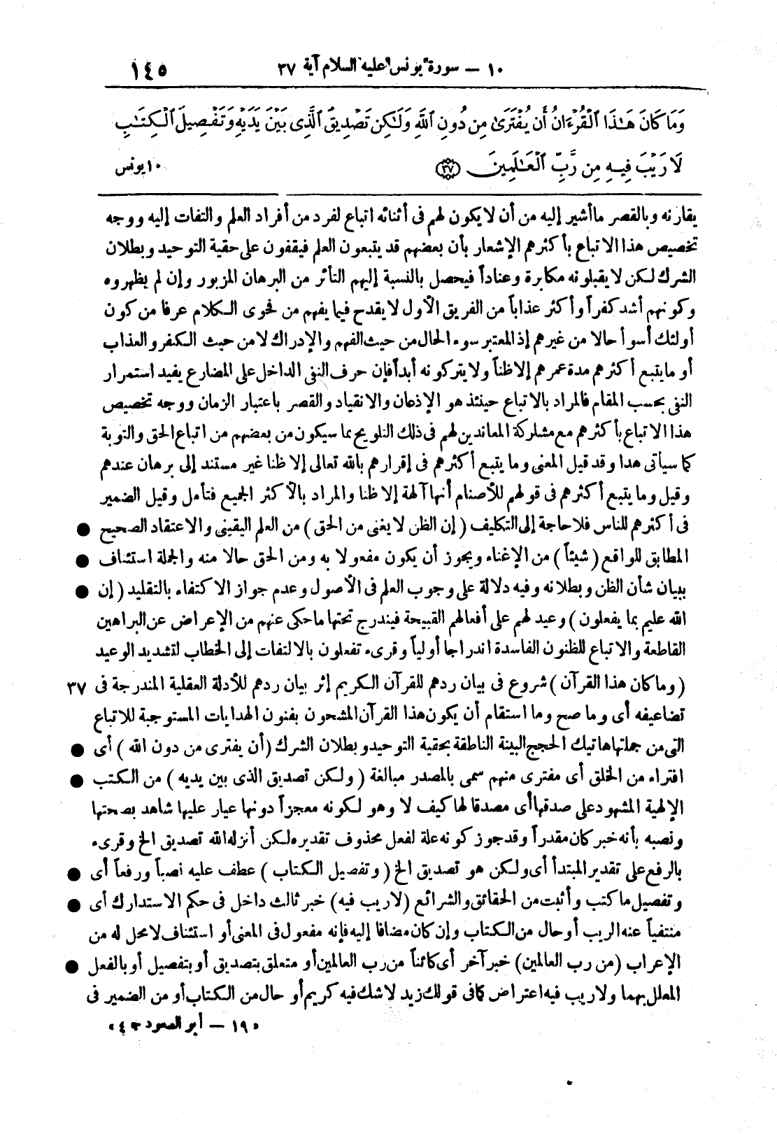 سورة يونس (37) يقارنه وبالقصر ما أشيرَ إليهِ من أن لا يكونَ لهم في أثنائه اتباعٌ لفرد من أفراد العلمِ والتفاتٌ إليه ووجهُ تخصيصِ هذا الاتباعِ بأكثرهم الإشعارُ بأن بعضَهم قد يتبعون العلم فيقفون على حقية التوحيد وبطلان الشرك لكن لا يقبلونه مكابرةً وعناداً فيحصل بالنسبة إليهم التأثرُ من البرهان المزبورِ وإن لم يُظهروه وكونُهم أشدَّ كفرا وأكثر من الفريق الأولِ لا يقدح فيما يُفهم من فحوى الكلامِ عُرفاً من كون أولئك أسوأَ حالاً من غيرهم إذ المعتبرُ سوءُ الحالِ من حيث الفهمُ والإدراكُ لا من حيث الكفرُ والعذابُ أو ما يتبع أكثرُهم مدةَ عمرِهم إلا ظناً ولا يتركونه أبداً فإن حرفَ النفي الداخلِ على المضارع يُفيد استمرارَ النَّفي بحسبِ المقامِ فالمرادُ بالاتباع حينئذٍ هو الإذعانُ والانقيادُ والقصرُ باعتبار الزمان ووجهُ تخصيصِ هذا الاتباعِ بأكثرهم مع مشاركة المعاندين لهم في ذلك التلويحُ بما سيكون من بعضهم من اتباع الحقِّ والتوبةِ كما سيأتي هذا وقد قيل المعنى وما يتبع أكثرُهم في إقرارهم بالله تعالى إلا ظناً غيرَ مستندٍ إلى برهان عندهم وقيل وما يتبع أكثرُهم في قولهم للأصنام إنها آلهةٌ إلا ظناً والمرادُ بالأكثر الجميعُ فتأمل وقيل الضميرُ في أكثرهم للناس فلا حاجةَ إلى التكليف