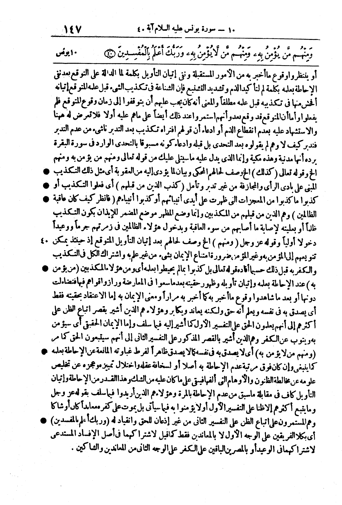 سورة يونس (40) أو ينتظروا وقوعَ ما أخبر به من الأمور المستقبلةِ ونفيُ إتيان التأويل بكلمة لمّا الدالةِ على التوقع بعد نفي الإحاطةِ بعلمه بكلمة لم لتأكيد الذمِّ وتشديد التشنيعِ فإن الشناعةَ في تكذيب الشيء قبل علمِه المتوقّعِ إتيانُه أفحشُ منها في تكذيبه قبل علمِه مطلقاً والمعنى أنه كان يجبُ عليهم أنْ يتوقفوا إلى زمان وقوعِ المتوقَّعِ فلم يفعلوا وأما أن المتوقعَ قد وقع بعدُ وأنهم استمرّوا عند ذلك أيضاً على ما هم عليه أولا فلا تعرض له ههنا والاستشهادُ عليه بعدم انقطاعِ الذمِّ أو ادعاءُ أن قولَهم افتراه تكذيبٌ بعد التدبر ناشىءٌ من عدم التدبر فتدبر كيف لا وهم لم يقولوه بعد التحدى بل قبله وادعاءُ كونِه مسبوقاً بالتحدي الواردِ في سورة البقرة يردّه أنها مدنية وهذه مكيةٌ وإنما الذي يدلُّ عليهِ ما سيتلى عليك من قوله تعالى وَمِنْهُمْ مَّن يُؤْمِنُ بِهِ وَمِنْهُمْ الخ وقوله تعالى
