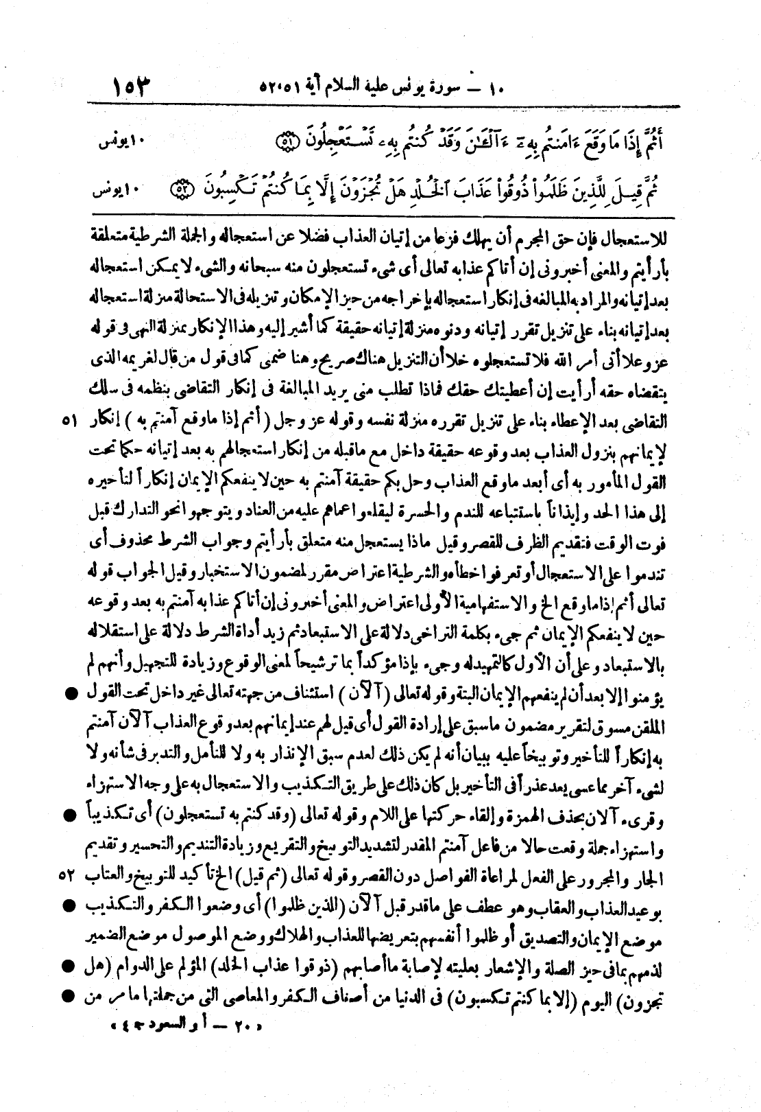 سورة يونس (51 52) للاستعجال فإن حقَّ المجرمِ أن يَهلك فزَعاً من إتيان العذابِ فضلاً عن استعجاله والجملةُ الشرطيةُ متعلقةٌ بأرأيتم والمعنى أخبروني إن أتاكم عذابُه تعالى أيَّ شيءٍ تستعجلون منه سبحانه والشيءُ لا يمكن استعجالُه بعد إتيانِه والمرادُ به المبالغةُ في إنكار استعجالِه بإخراجه من حيز الإمكانِ وتنزيلُه في الاستحالة منزلةَ استعجالِه بعد إتيانِه بناءً على تنزيل تقرر إتيانِه ودنوِّه منزلةَ إتيانه حقيقةً كما أشير إليه وهذا الإنكارُ بمنزلة النهي في قوله عز وعلا أتى أَمْرُ الله فَلاَ تَسْتَعْجِلُوهُ خلا أن التنزيلَ هناك صريحٌ وهنا ضمنيٌّ كما في قول من قال لغريمه الذي يتقضّاه حقَّه أرأيتَ إن أعطيتُك حقَّك فماذا تطلُب مني يريد المبالغةَ في إنكار التقاضي بنظمه في سلك التقاضي بعد الإعطاءِ بناءً على تنزيل تقرّرِه منزلة نفسه وقوله عز وجل